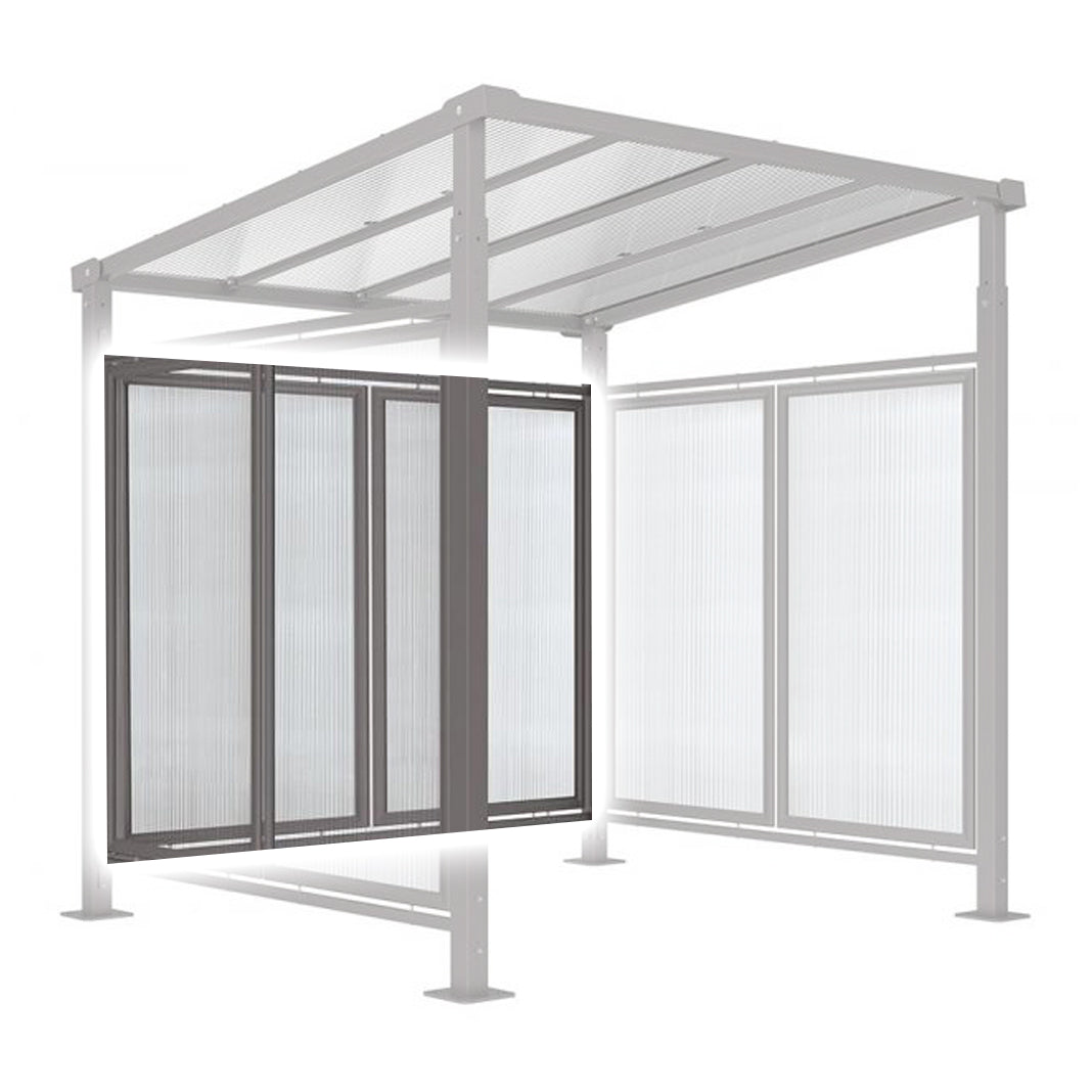 These rear cladding panels come complete with colour coded frames and offer protection from wind and rain from the rear. The transparent elements are made from anti UV treated cellular polycarbonate.