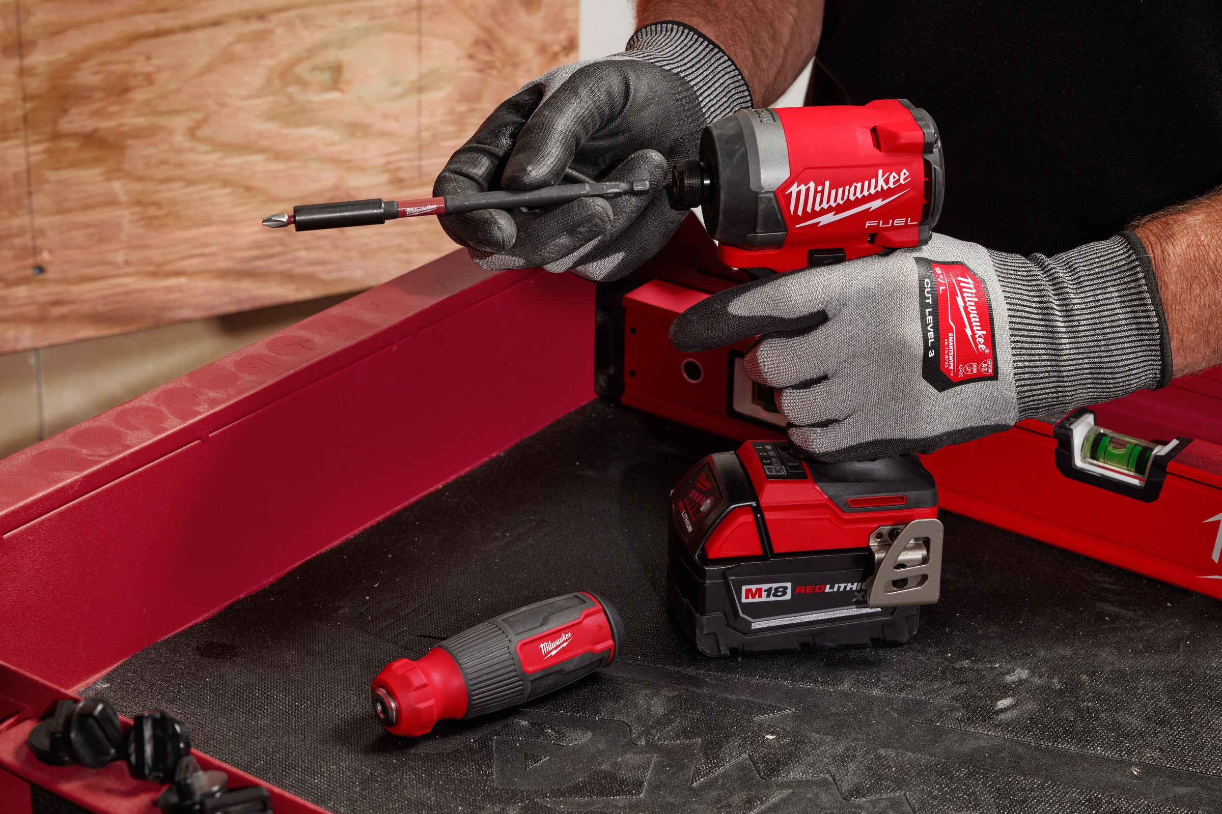 This Shockwave ratcheting screwdriver from Milwaukee is a screwdriver of two roles. The shank of the driver can be used in the ratcheting handle for manual removal and tightening of screws, for precision control; however when needed the shank can be put into an impact driver, allowing you to drive home screws effortlessly. All Bits and the shank are Shockwave (impact) rated, meaning they can stand up to the brutal impacts of an impact driver.