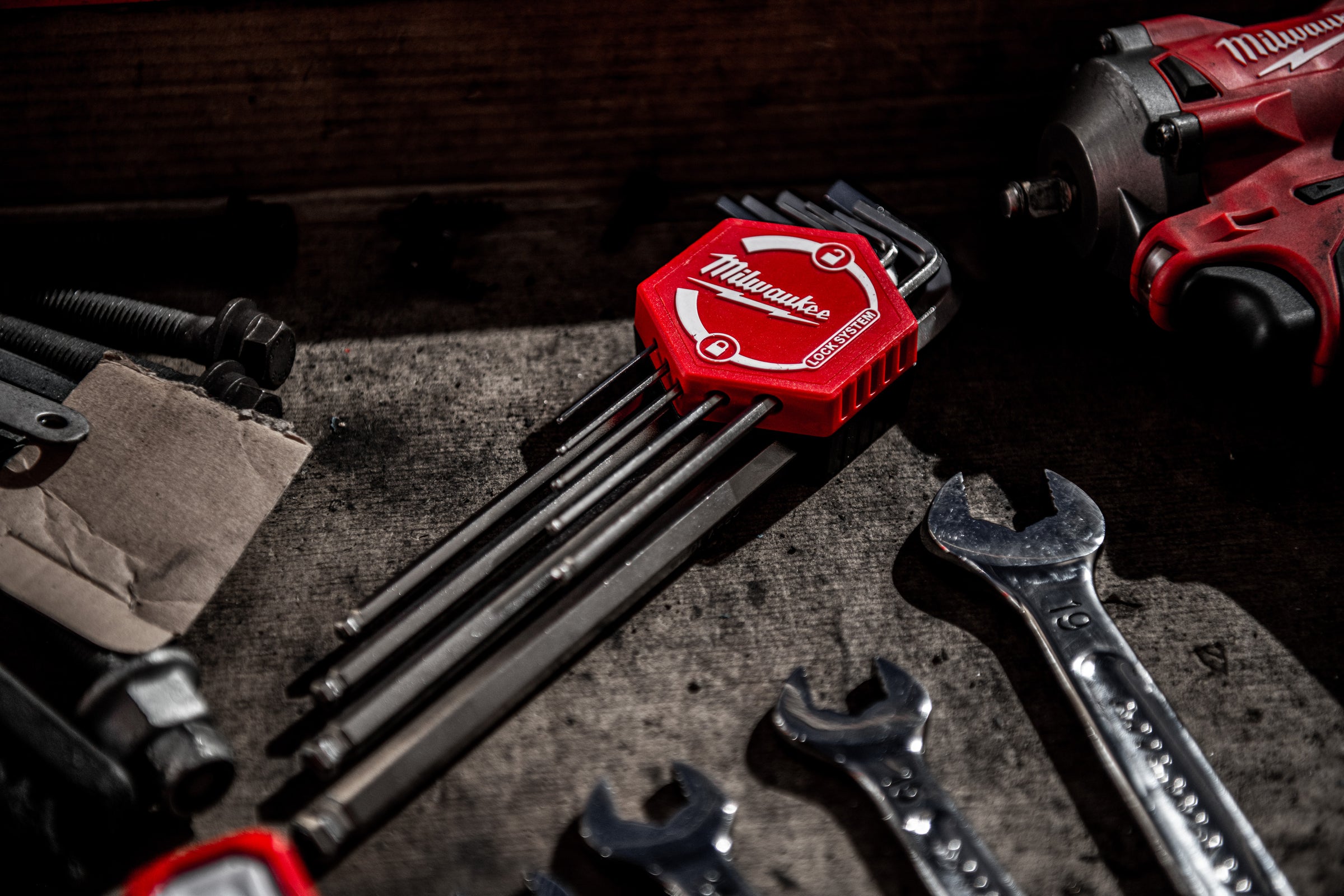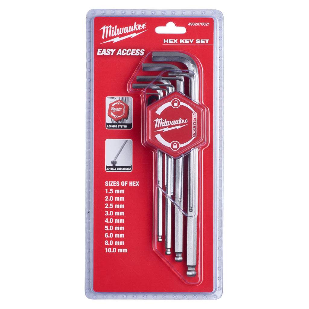 This full 9-piece hex allen key set from Milwaukee comes complete with a twist-lock storage and transport clip. This makes accessing and transporting your hex keys easy and secure, and also provides a secure lanyard attachment point for working at height. These larger keys (compared to the compact alternative) offer better reach and leverage when working in hard-to-reach areas on vehicles and machinery.
