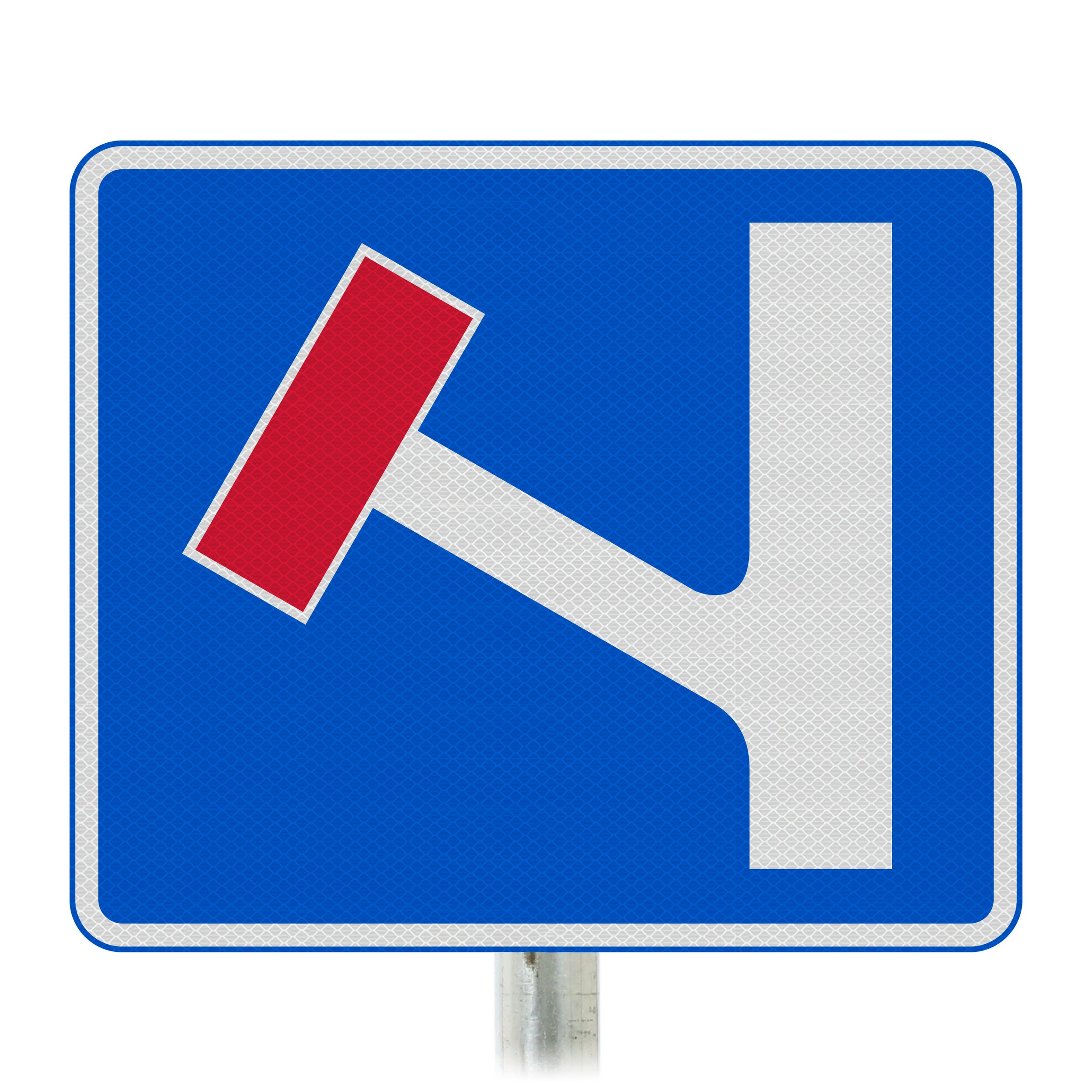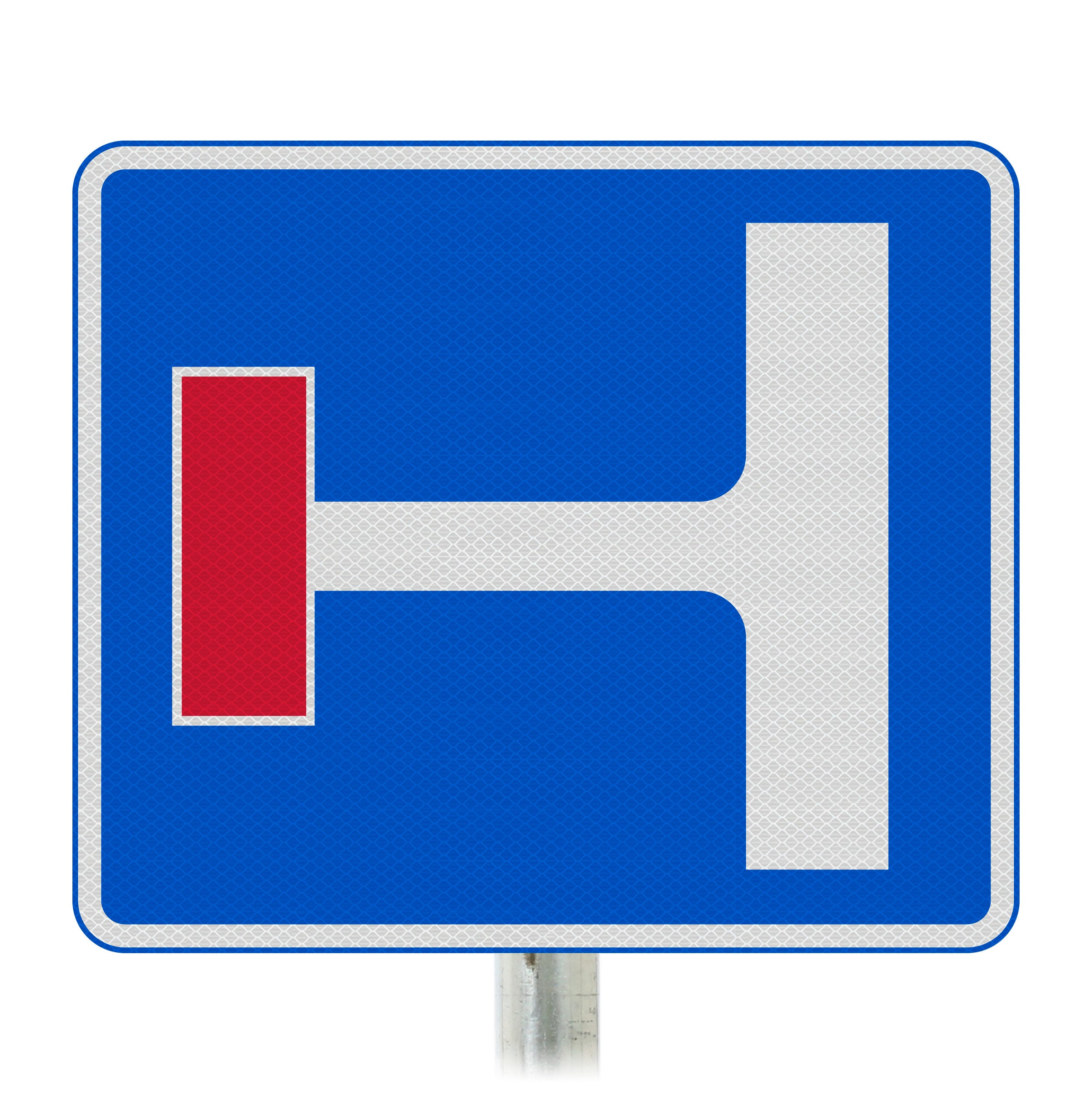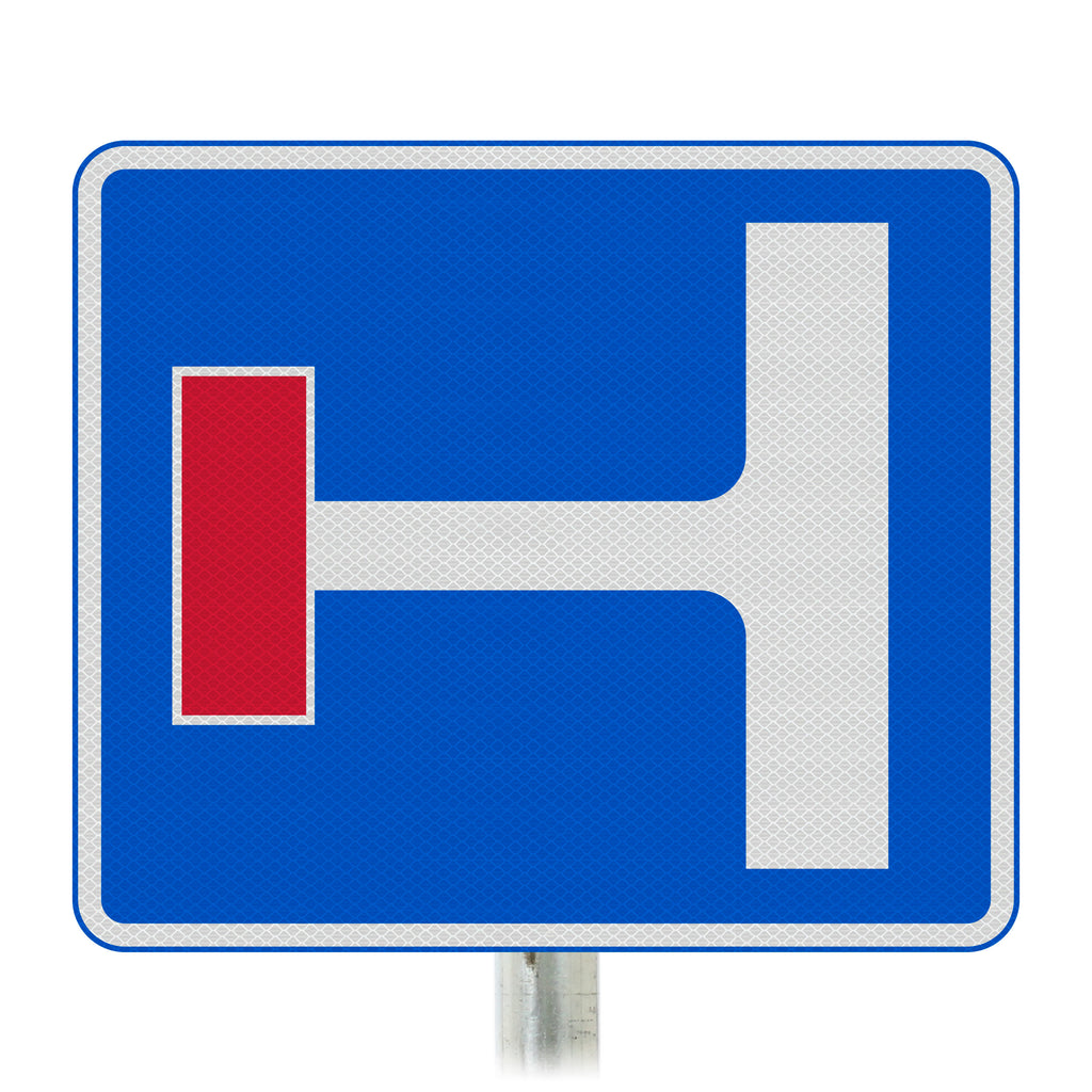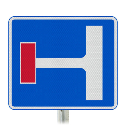 This sign informs drivers that a side street of their current route is a dead end and provides no through route for drivers of vehicles if they were to turn left. This sign comes in a number of sizes and can be chosen in a left or right configuration, as well as having the angle of the junction altered to represent the road at the installation site.