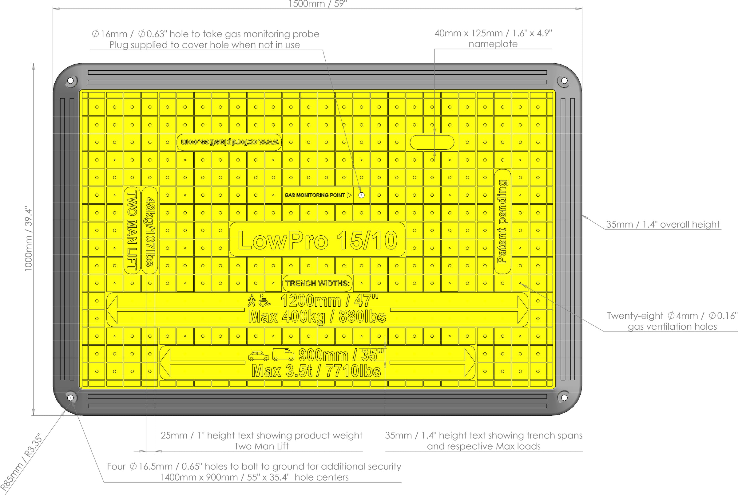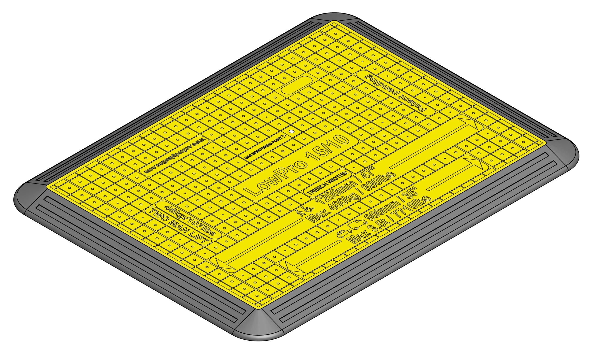 This product has all of the key features of the Low-Pro 1010 cover but with improved load and trench width capabilities. The LowPro 15/10 can support one wheel of a 3500kg vehicle over a 900mm span or up to 400kg over a 1200mm span. In most site applications, additional fixings will not need to be used (subject to risk assessment).
