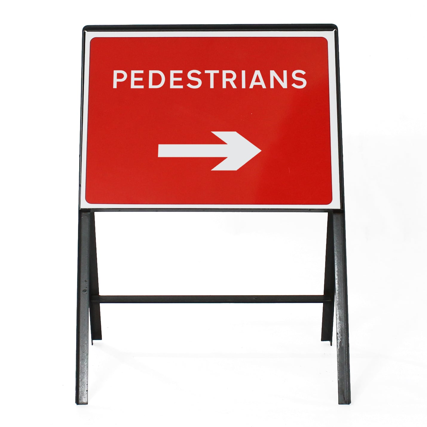 - Chapter 8 compliant Pedestrians with Arrow Right sign in a 600x450mm size.