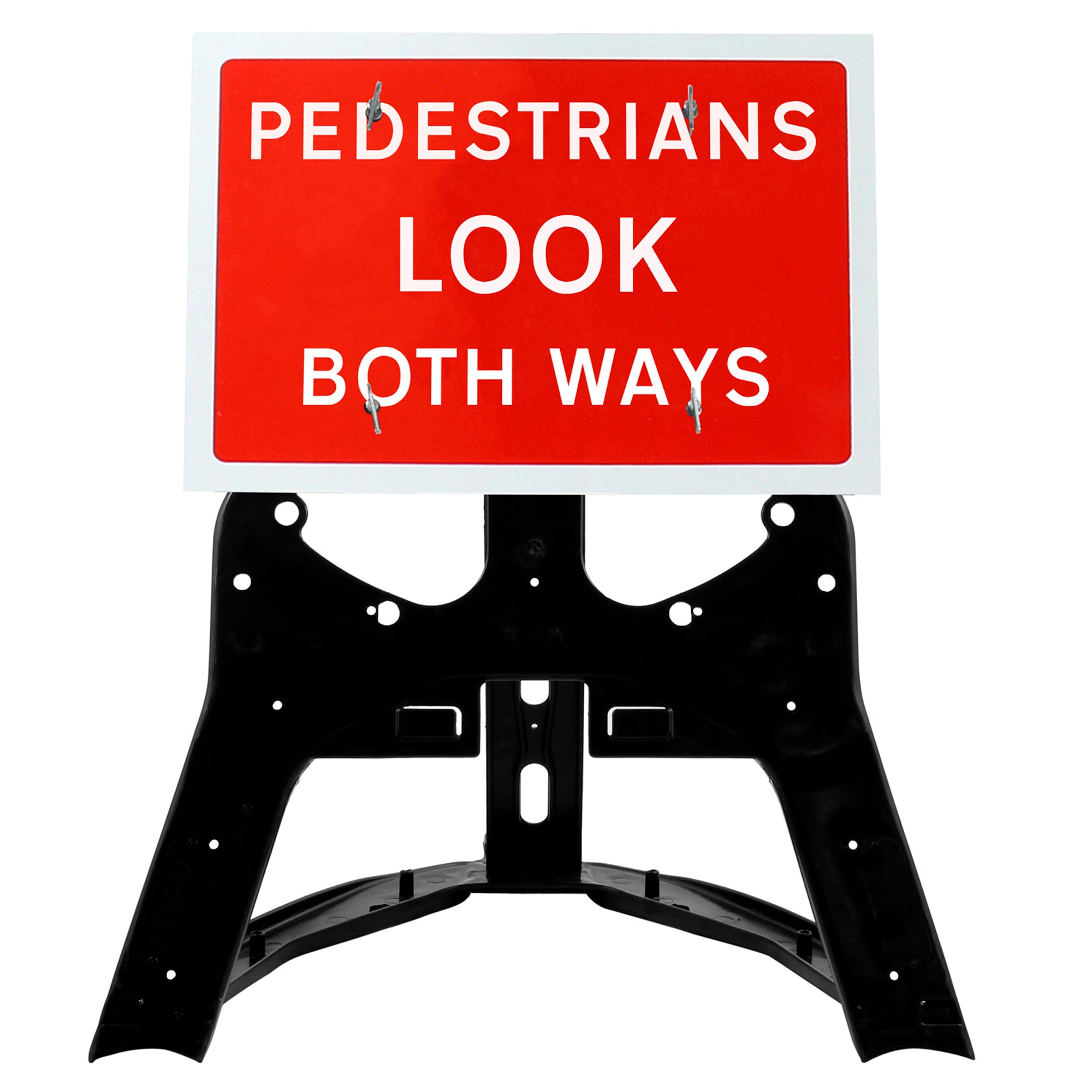 This Pedestrians Look Both Ways 7017 QuickFit EnduraSign is part of our new range of quality plastic QuickFit EnduraSigns. Supplied complete with a frame this safety sign can be quickly set up on-site helping pedestrians navigate safely. The sign face is attached to the included frame with four quick fit toggles at 300mm centres.