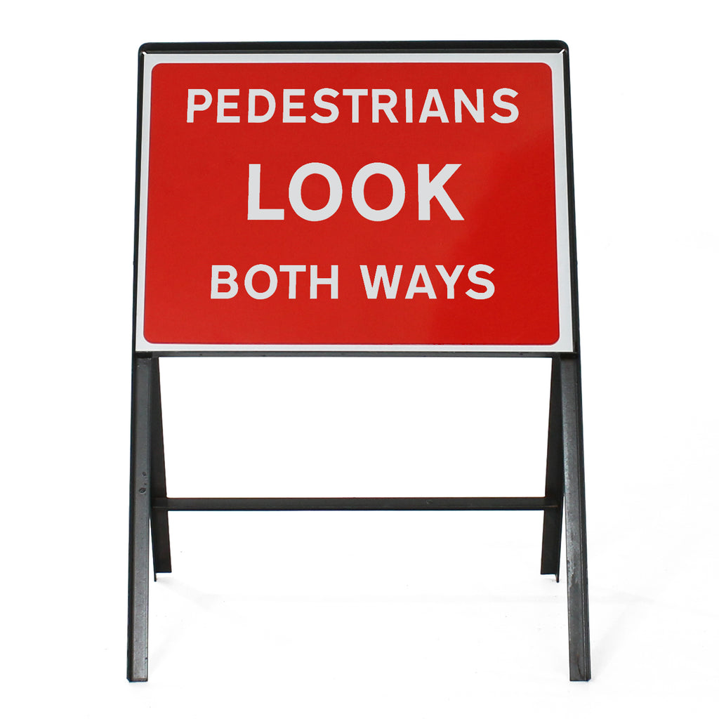 - Chapter 8 compliant Pedestrians Look Both Ways sign in a 600x450mm size.