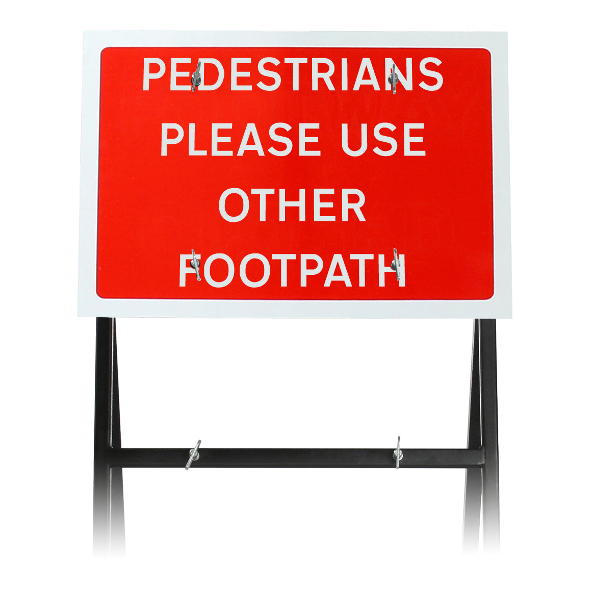 This 600x450mm quick fit sign face politely instructs pedestrains to use the other footpath. It is commonly seen during utility works, or where environmental factors such as flooding have made an area inaccessible.