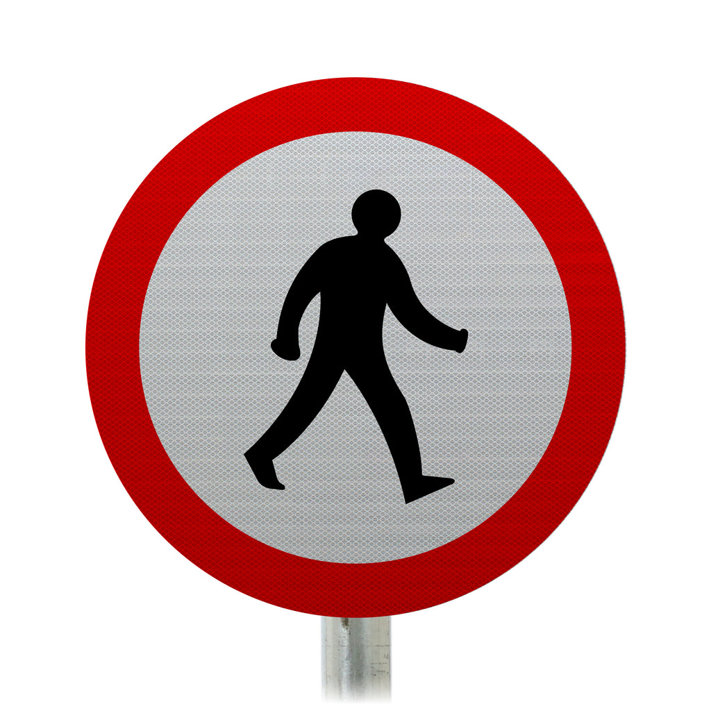 The no pedestrians regulatory sign means the public are not allowed to walk along the road or pathway. The sign is part of our circular regulatory sign range.