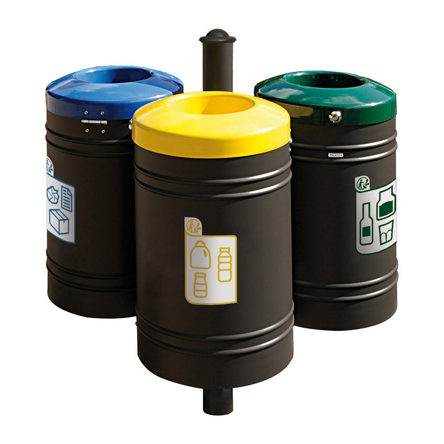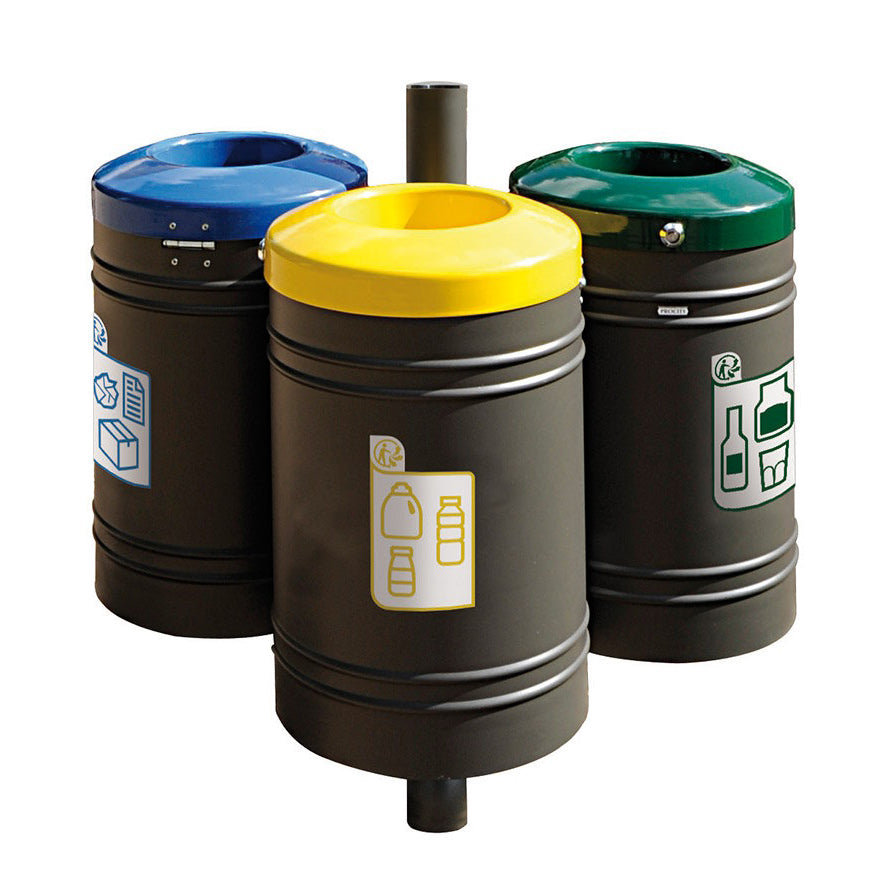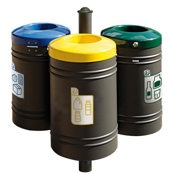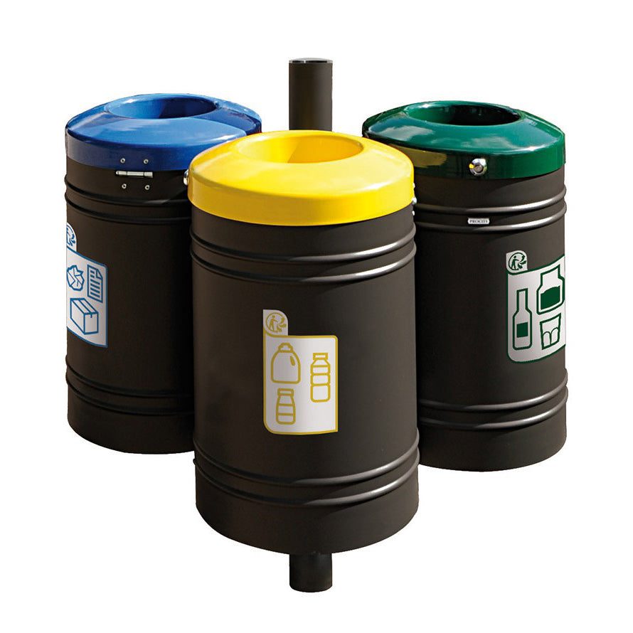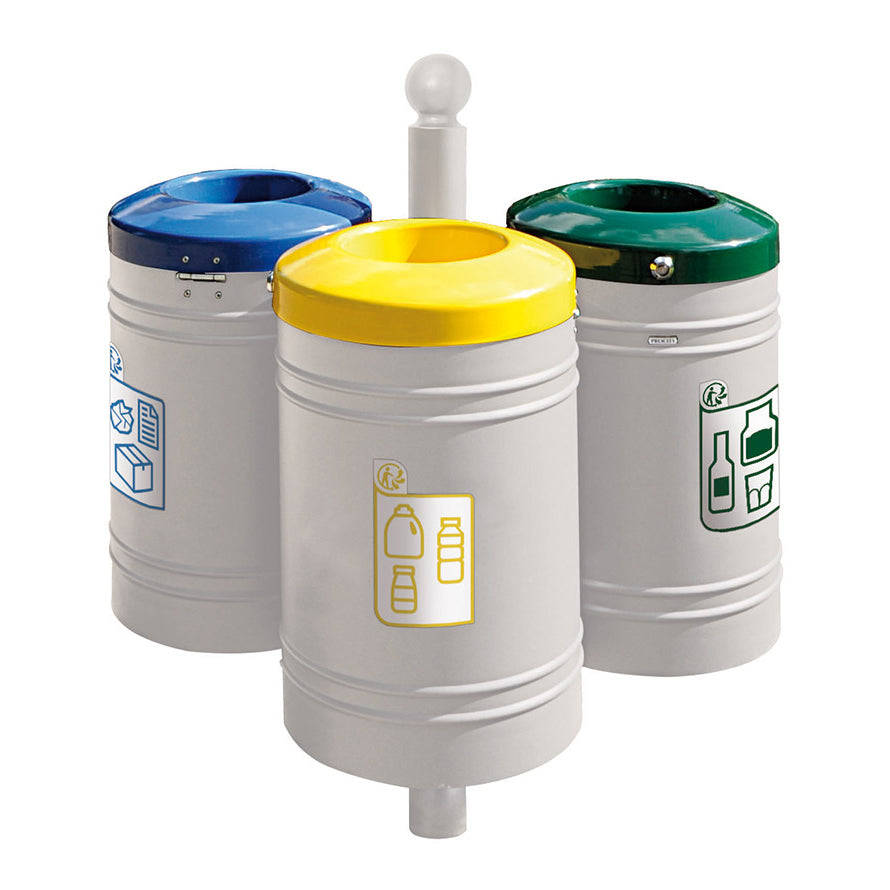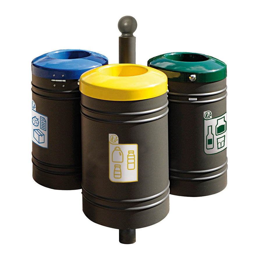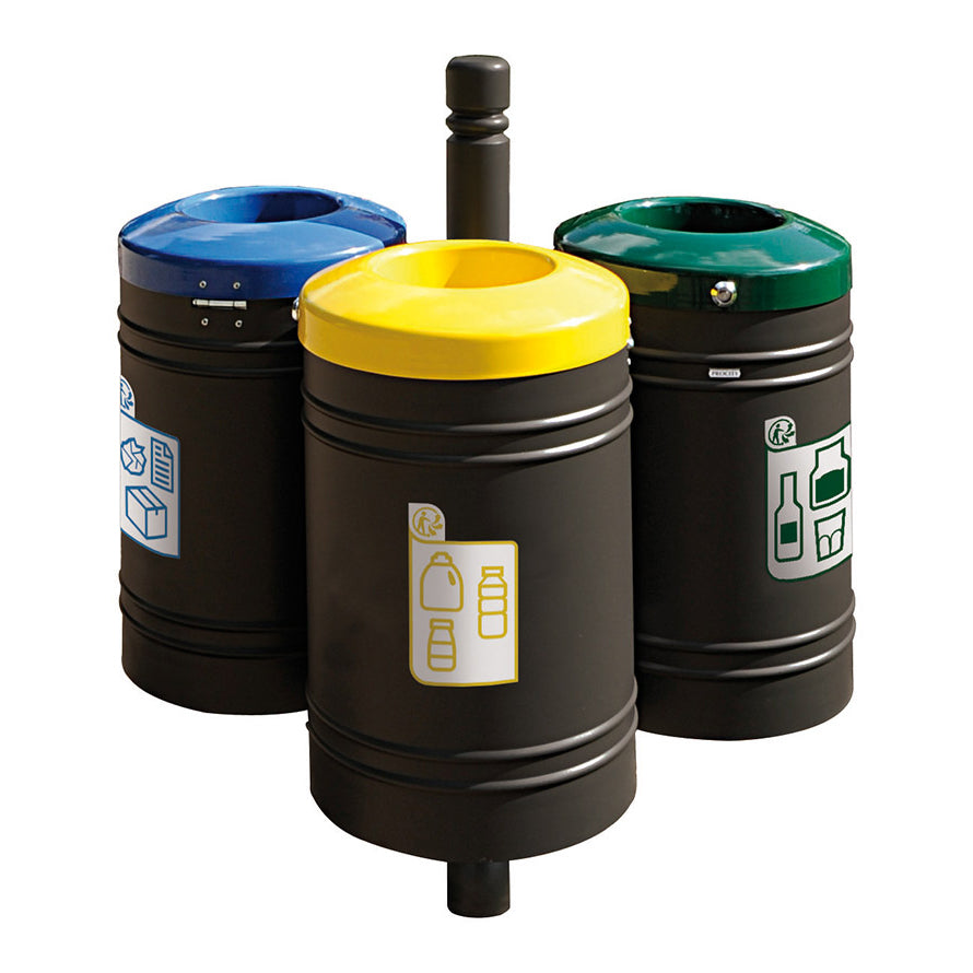 The Procity Selective Sort Recycling Bin Kit, with each bin holding a total capacity of 40L, features a design similar to the Procity Litter Bin on Side Mounted Post. This kit assembles one to three Procity litter bins around a central post to create a set. The central post can be finished with your choice of four decorative top caps from the Province collection - City, Agora, Sphere and Brushed Stainless Steel.