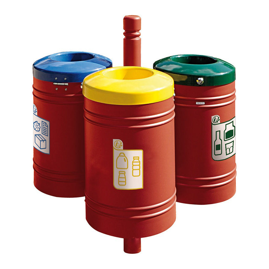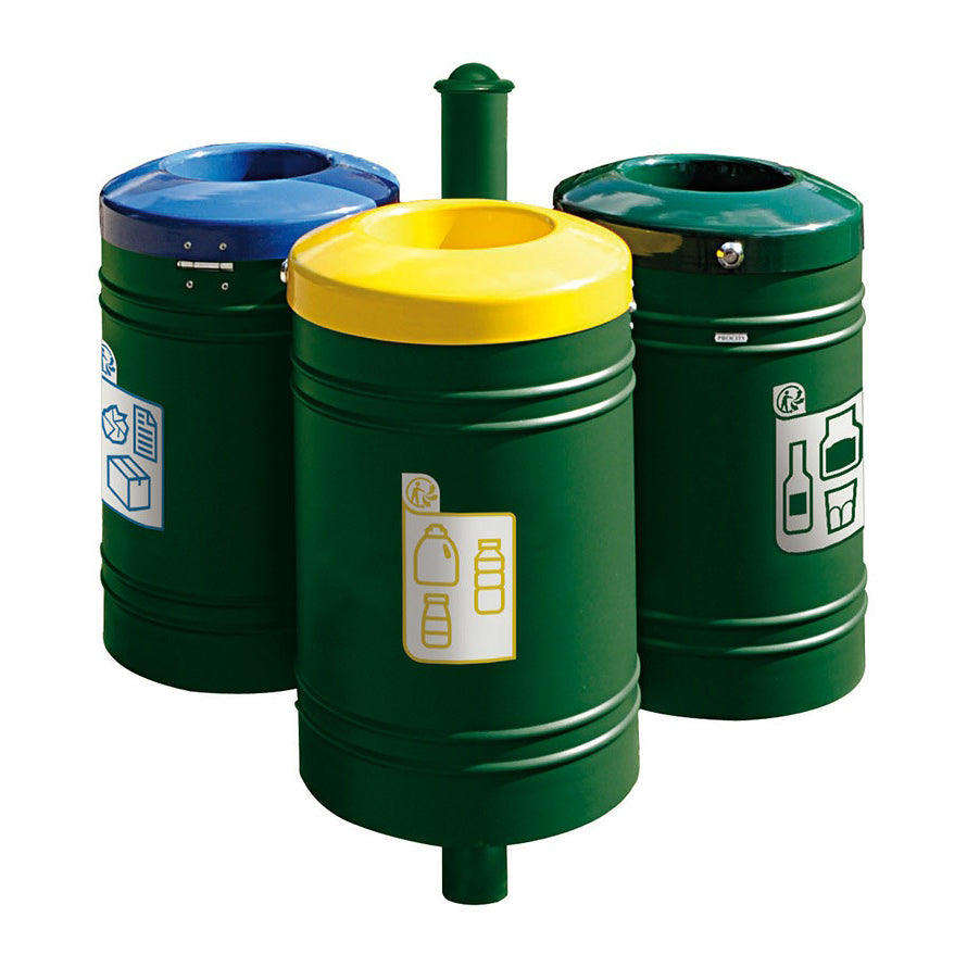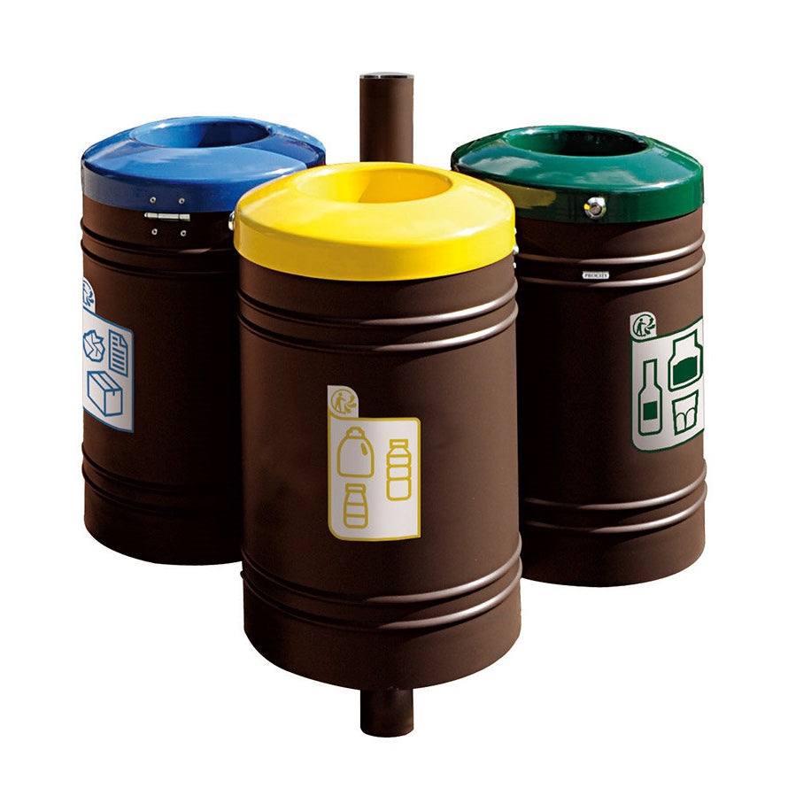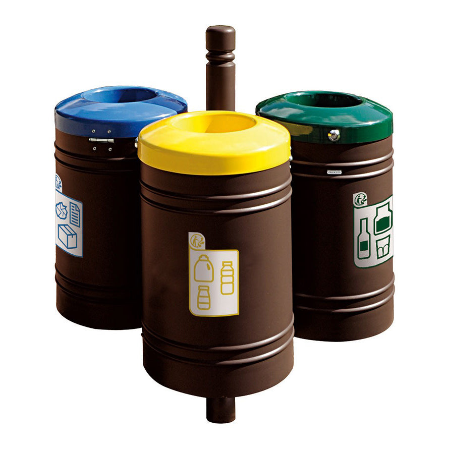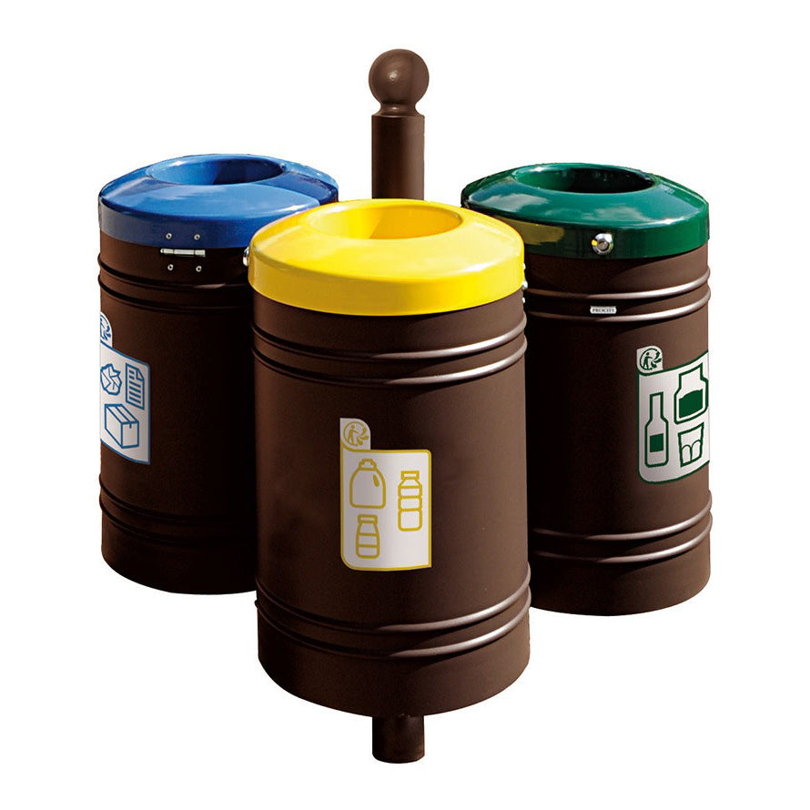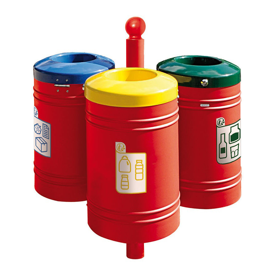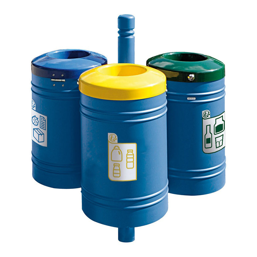 The Procity Selective Sort Recycling Bin Kit, with each bin holding a total capacity of 40L, features a design similar to the Procity Litter Bin on Side Mounted Post. This kit assembles one to three Procity litter bins around a central post to create a set. The central post can be finished with your choice of four decorative top caps from the Province collection - City, Agora, Sphere and Brushed Stainless Steel.