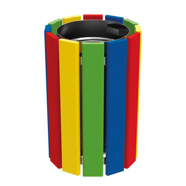 This bin features bright, colourful slats with a single or multicoloured lacquered finish in RAL 3020 (Traffic red), RAL 1023 (Traffic Yellow), RAL 6018 (Yellow-green), or RAL 5010 (Gentian Blue). The vibrant colour scheme is designed to stimulate children's creativity and imagination.