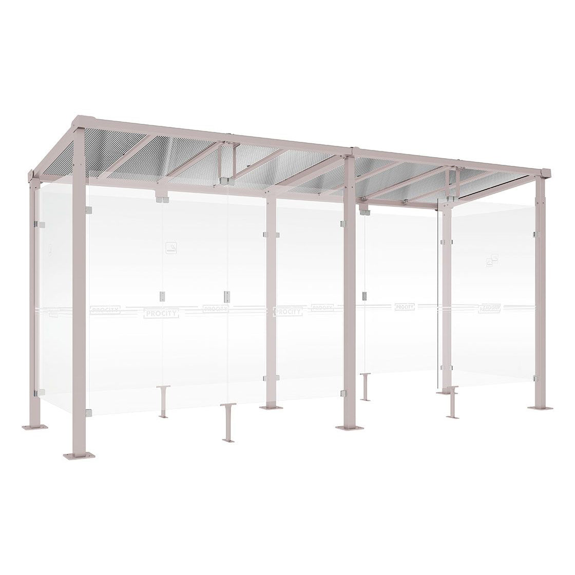 This shelter's structure includes front, side, and back panels made from 8 mm safety glass. We offer the option to choose between the two lengths of 2.5 and 5 metres, allowing for adaptation to various spaces and use cases.