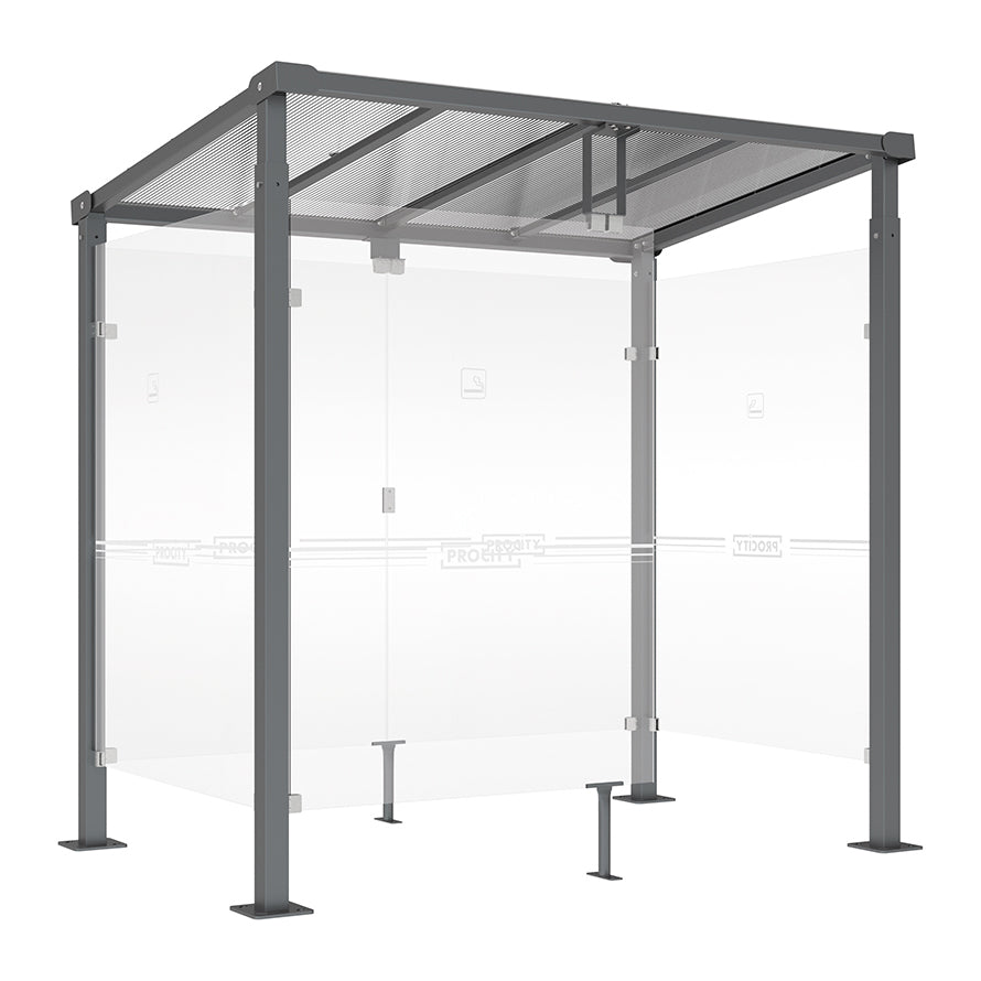 This shelter offers a similar style and responds to similar use cases as the Procity Modulo Smoking Shelter, with a more classic roof.