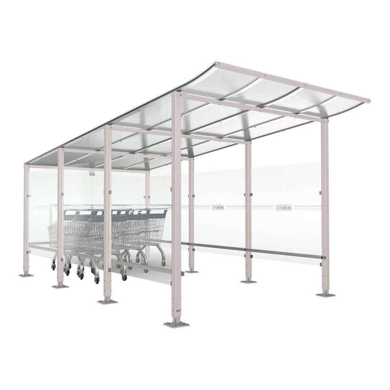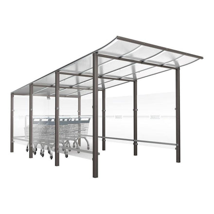 Made from galvanised steel, anodised aluminium, and toughened glass, this high-quality trolley management option is designed to last for extended periods with minimal maintenance. The angled, UV-resistant polycarbonate roof not only shields trolleys from the weather but also directs rainwater away from customers, so no one gets dripped on while grabbing a trolley.