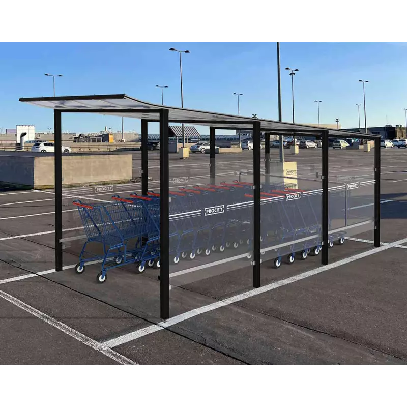 The Procity Modulo Caddie Shelter (Trolley Shelter) is a slick way of improving trolley management in car parks, making it simpler, safer, and tidier for customers and reducing costs related to damage for owners. Perfect for supermarkets, retail parks, and forecourts, it holds three rows of trolleys securely while fitting into a standard parking bay without blocking traffic.