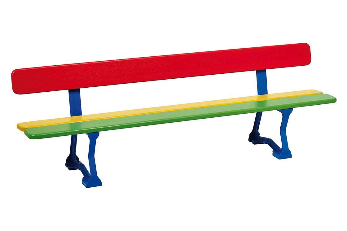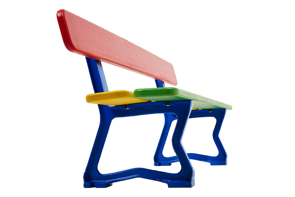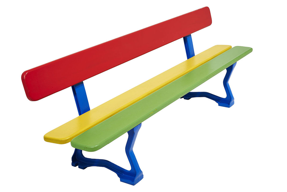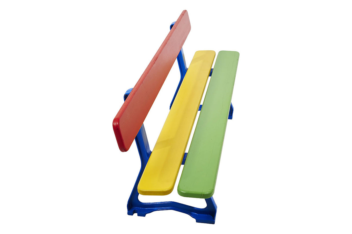 The bench's multicoloured lacquered finish in vibrant primary colours (RAL 3020 (red), RAL 1023 (yellow) and RAL 6018 (green)) not only adds visual appeal to the nursery school environment but also stimulates the creativity of young minds.