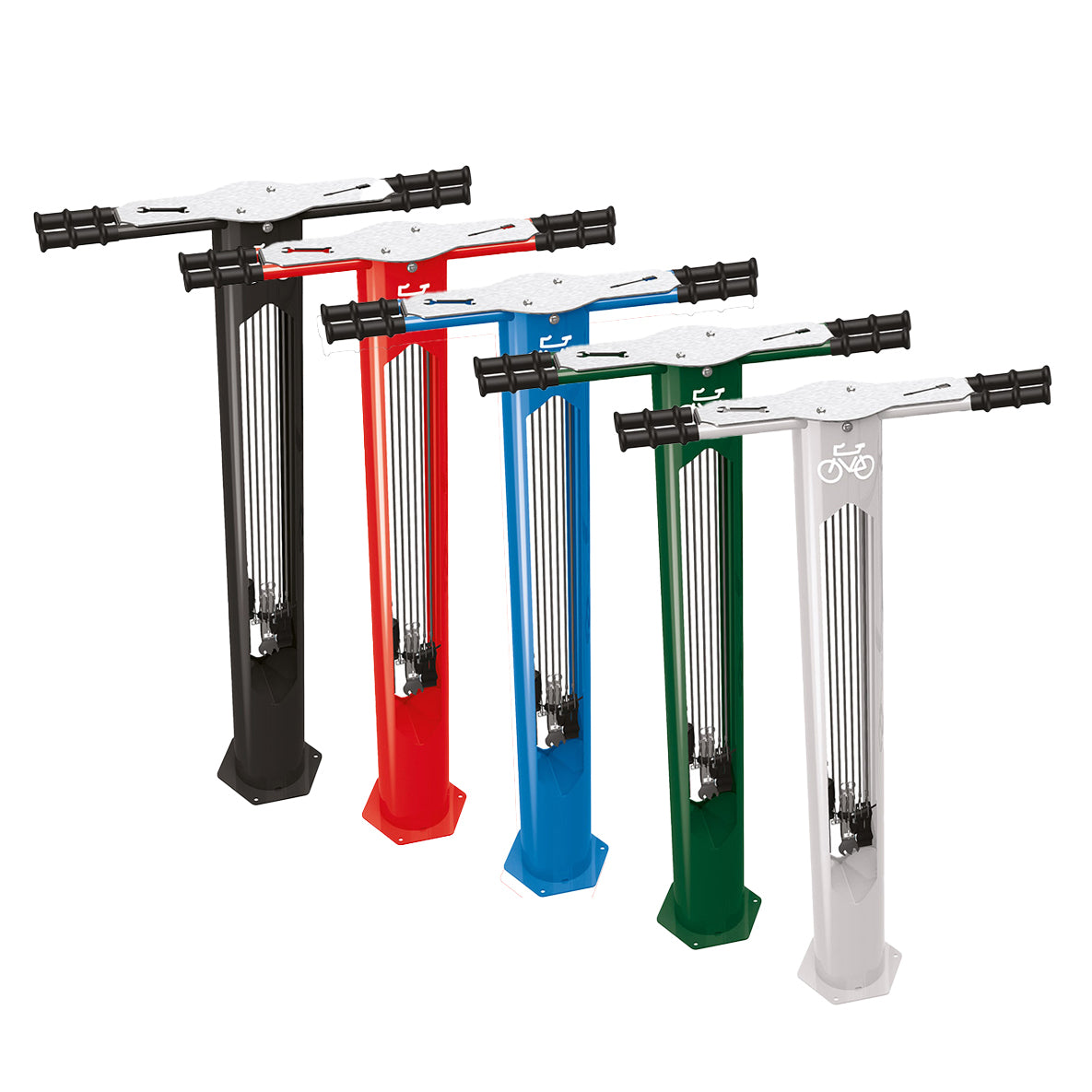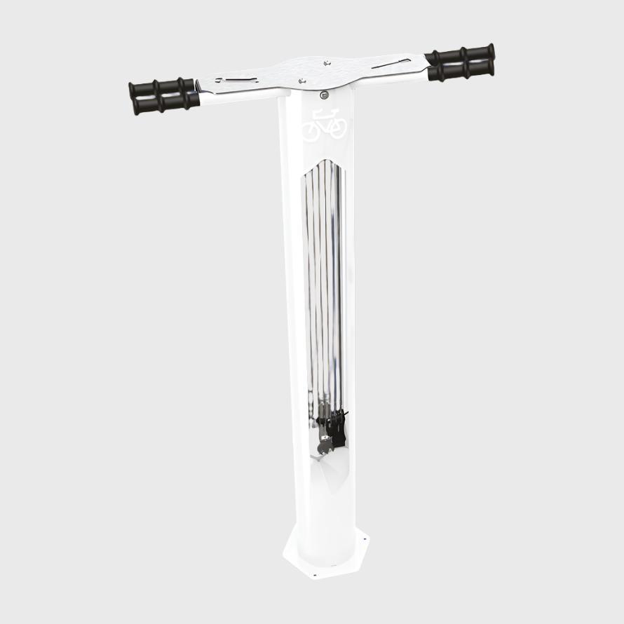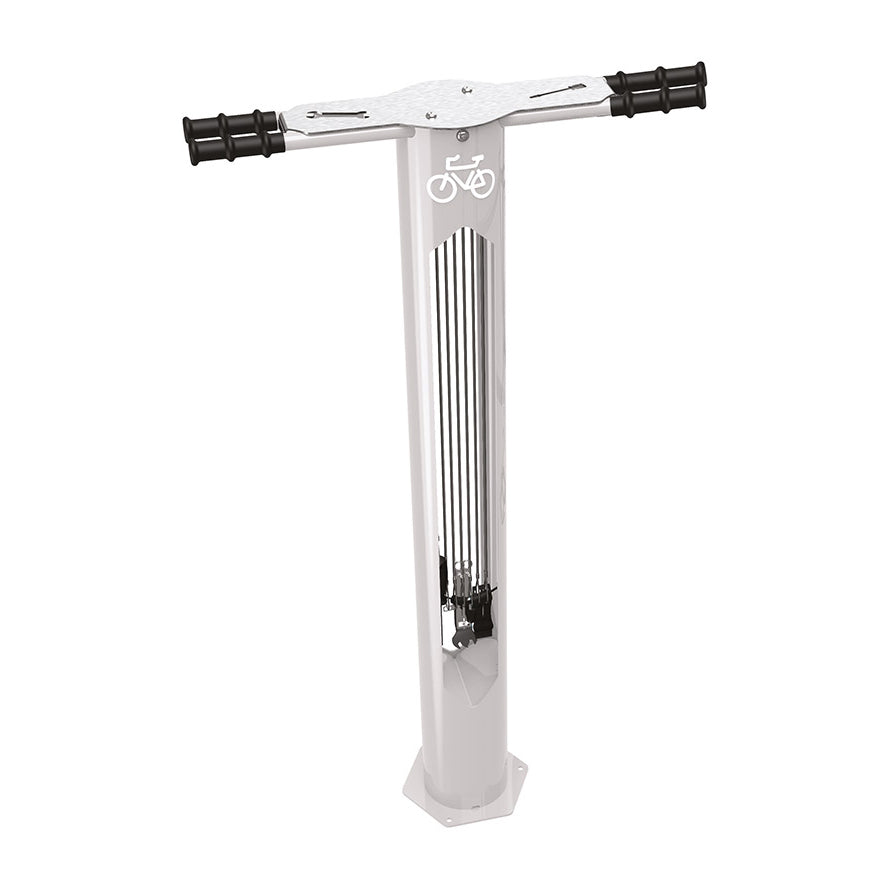 Bolted down to the ground using three 10mm expanding bolts (not included), the repair stand’s body is made from Ø 159 mm welded steel tube and Ø 25 mm steel crossbars. A brushed stainless steel cover makes it incredibly durable and resistant to the elements, even in saline environments like coastal towns.