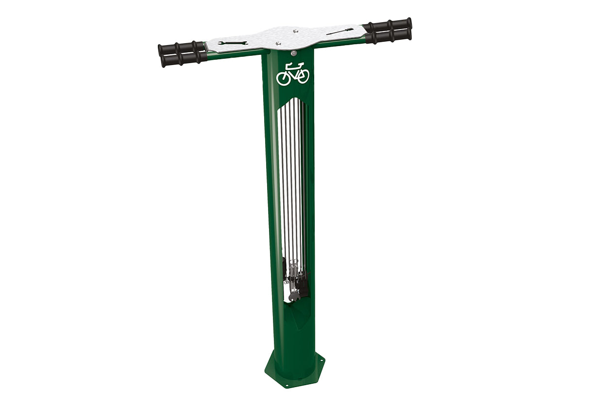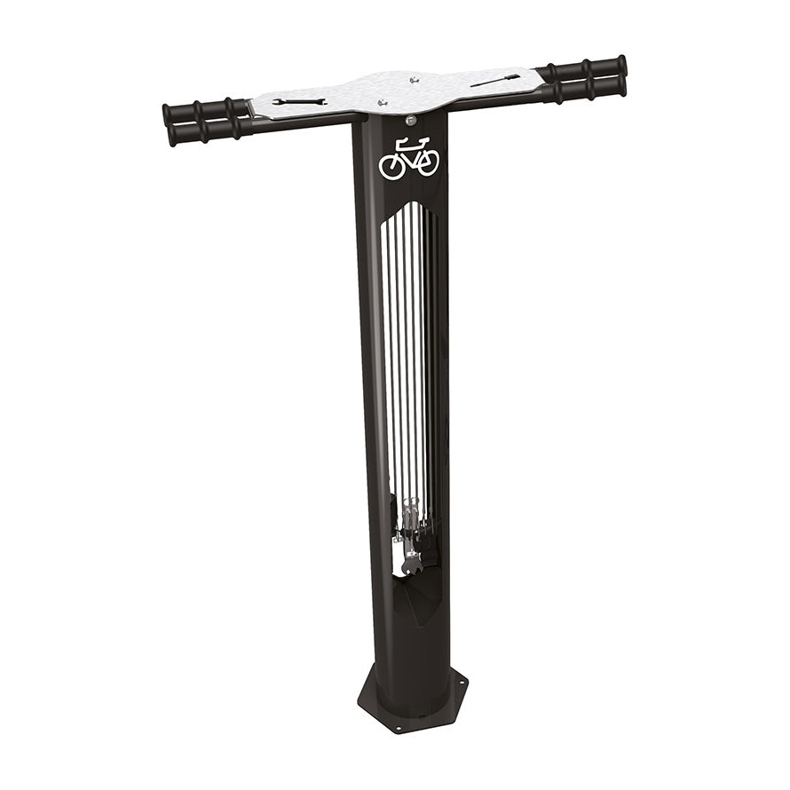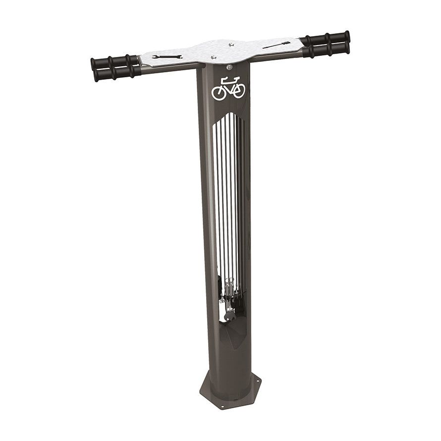 This innovative piece of street furniture is designed to fit into public areas and facilitate bike maintenance for cyclists. Often situated in town centres, or in parks, near popular biking trails, the repair station provides the core tools needed for most maintenance tasks performed on bikes: