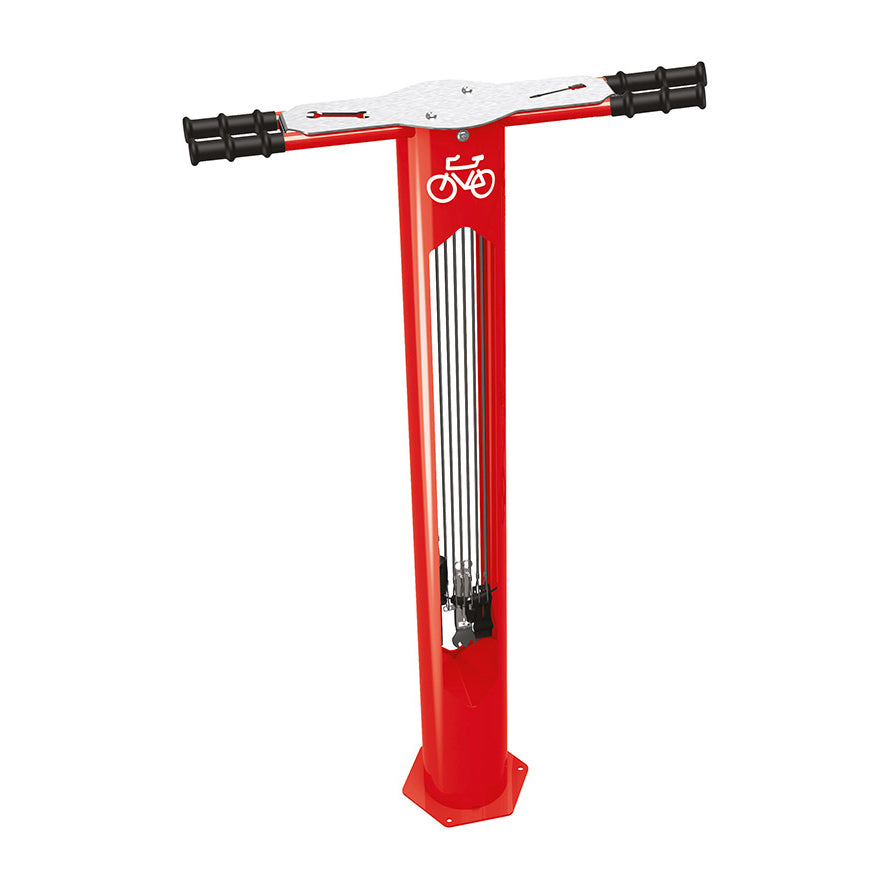 Procity offers an air pump designed for public spaces, an ideal complement to this bike repair stand. Placed side by side, this set allows users to inflate their tyres after replacing an inner tube, providing a comprehensive solution to many bicycle repair jobs.