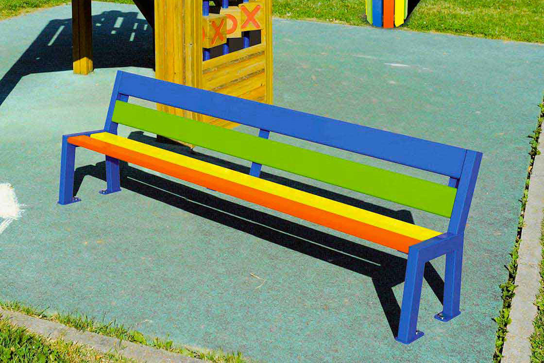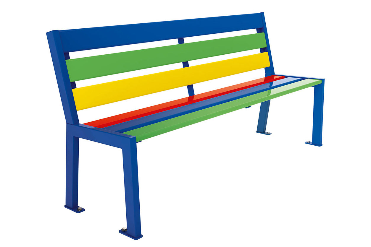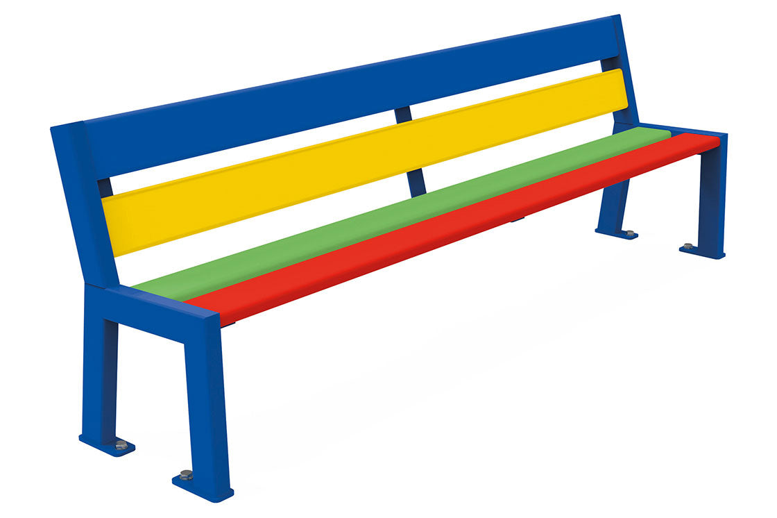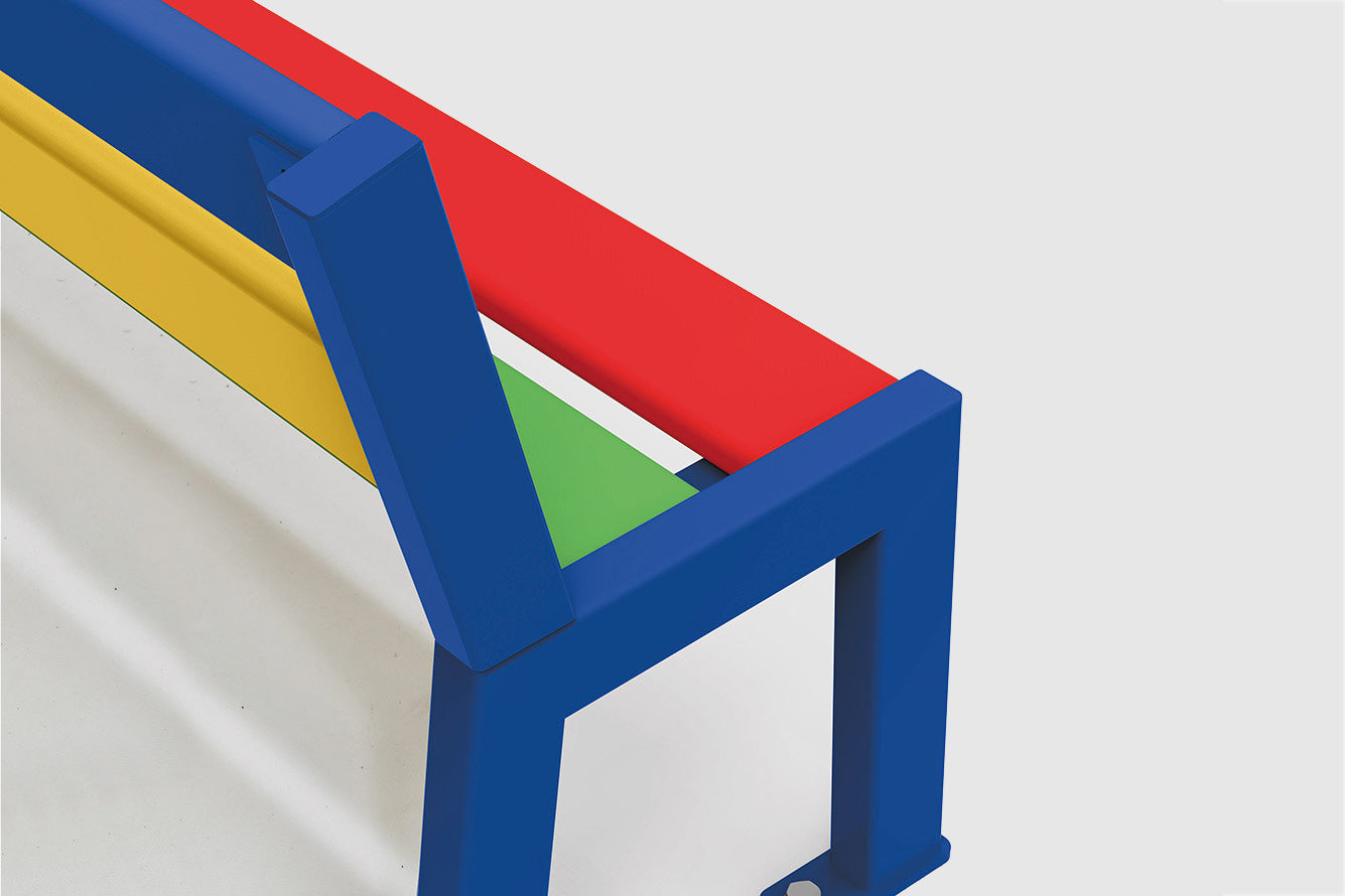 The slats making up the seat and backrest of the Silaos Junior bench are made from sustainably sourced hardwood, not only enjoying good durability but also captivating young minds with their vivid colours. Each slat is painted in a bright, primary colour: RAL 3020 (red), RAL 1023 (yellow), RAL 6018 (green), and RAL 5010 (blue), creating a visually stimulating experience that sparks creativity and imagination in children of any age. The frame of the Junior bench is made from zinc primed and painted in RAL 5010 (blue).