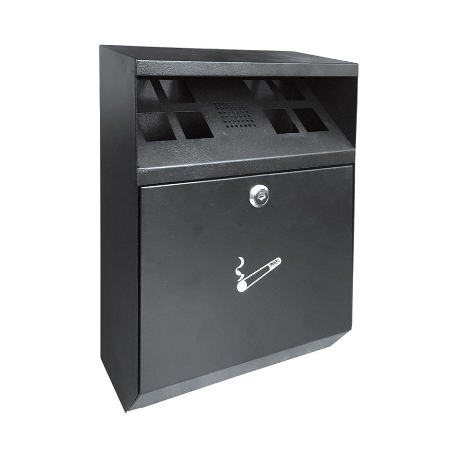 Built using black lacquered steel, the structure includes a grille designed to extinguish cigarettes while restricting oxygen flow inside and minimising fire propagation. The front door allows easy access to the internal tray for emptying and is secured with a cylinder key lock.