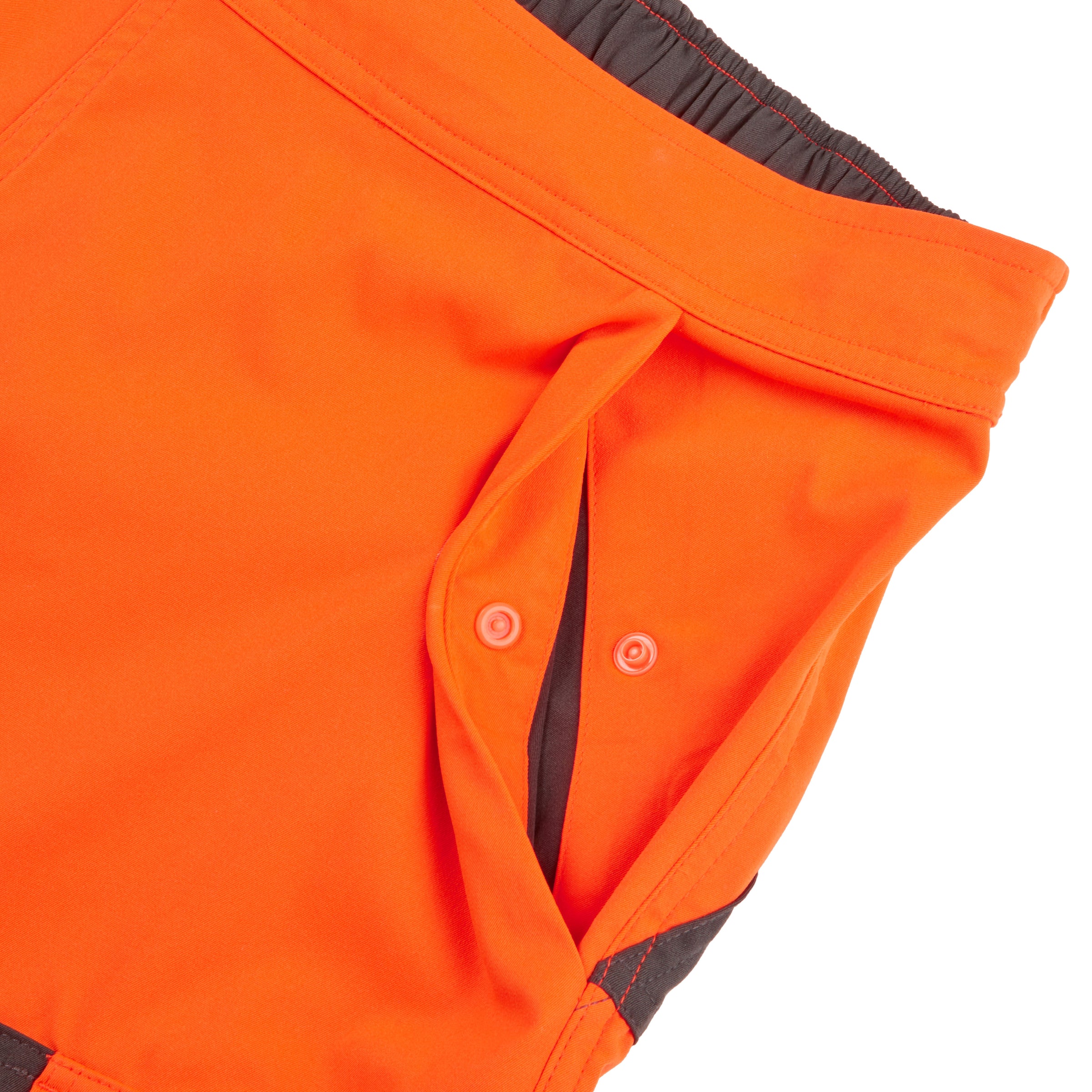 These orange trousers come with two colour options: either solid orange or alternatively orange with grey contrast panels. These contrast panels are ideal for areas where the front of the trousers quickly becomes dirty. The panels mask the dirt, allowing for longer periods between washes, which in turn extends the lifespan of the garment. This garment is certified for 25 washes while maintaining its luminosity and reflectivity ratings.