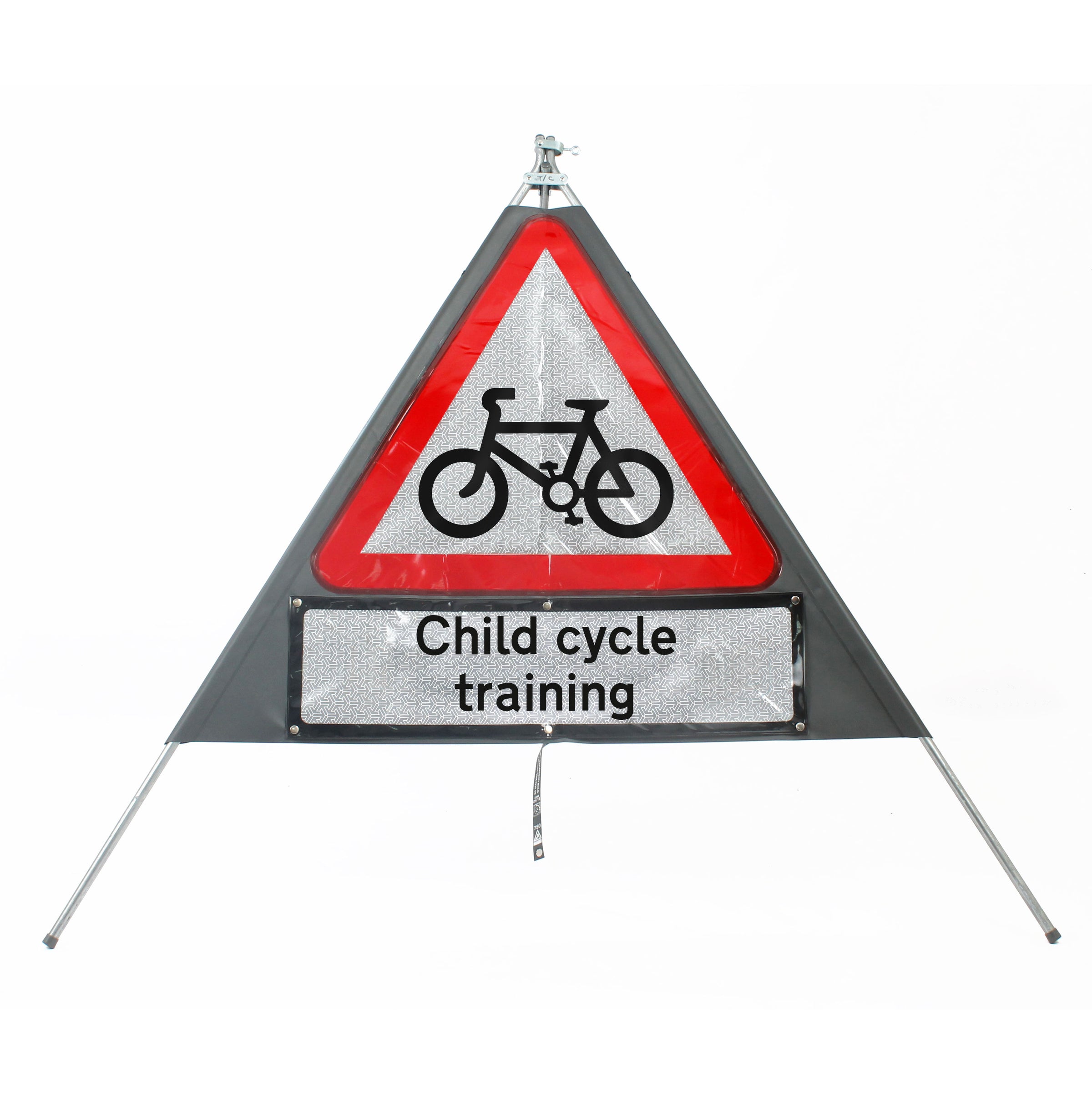 If you are looking for a compact sign to take with you to cycle training sessions, then this classic roll up sign from Quazar is a great choice. It features a clear warning triangle with a cycle symbol and a supplementary plate reading “Child cycle training”, clearly indicating to any passing motorists that they should expect to see children cycling along the route ahead and should therefore take extra care.