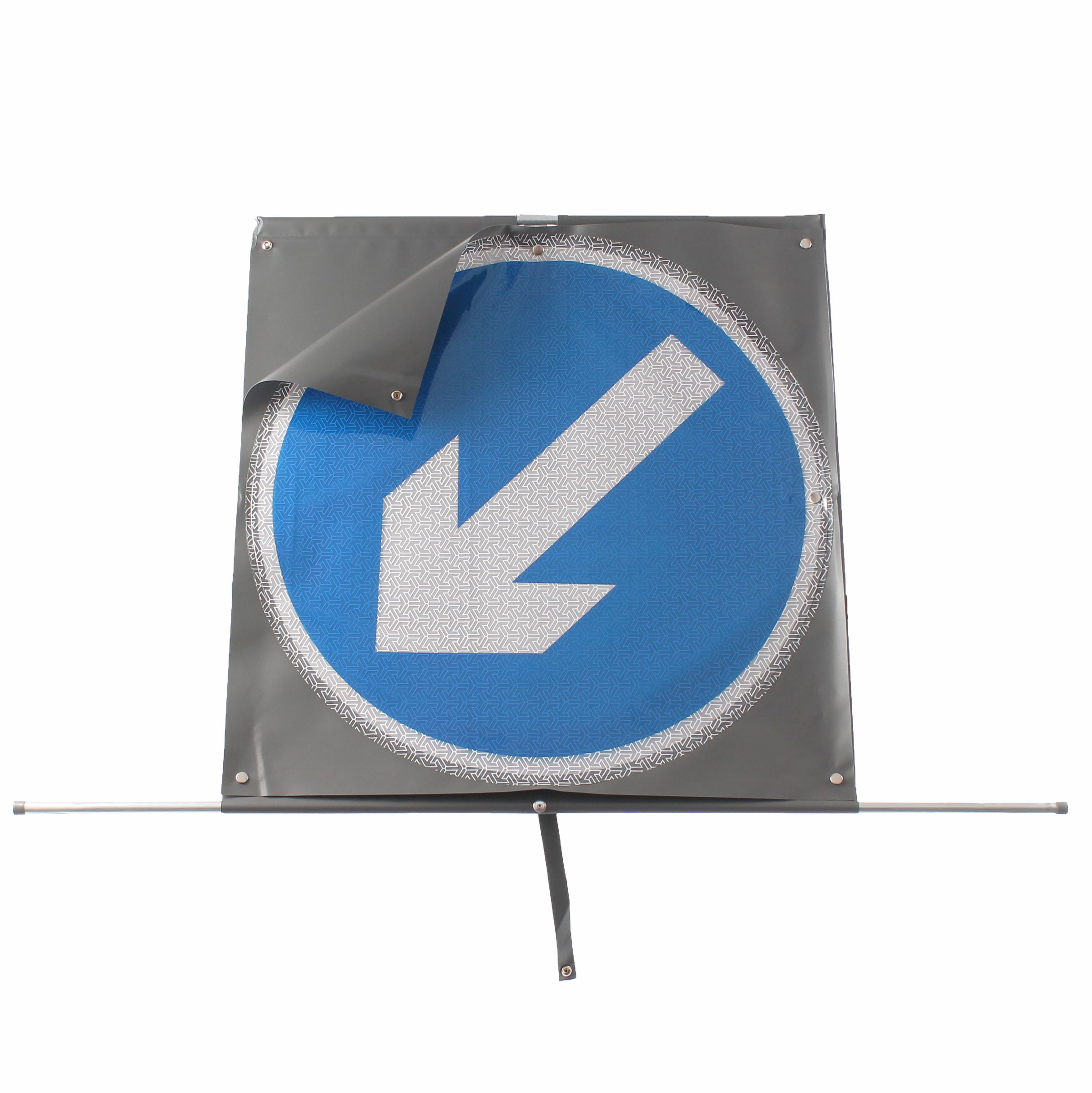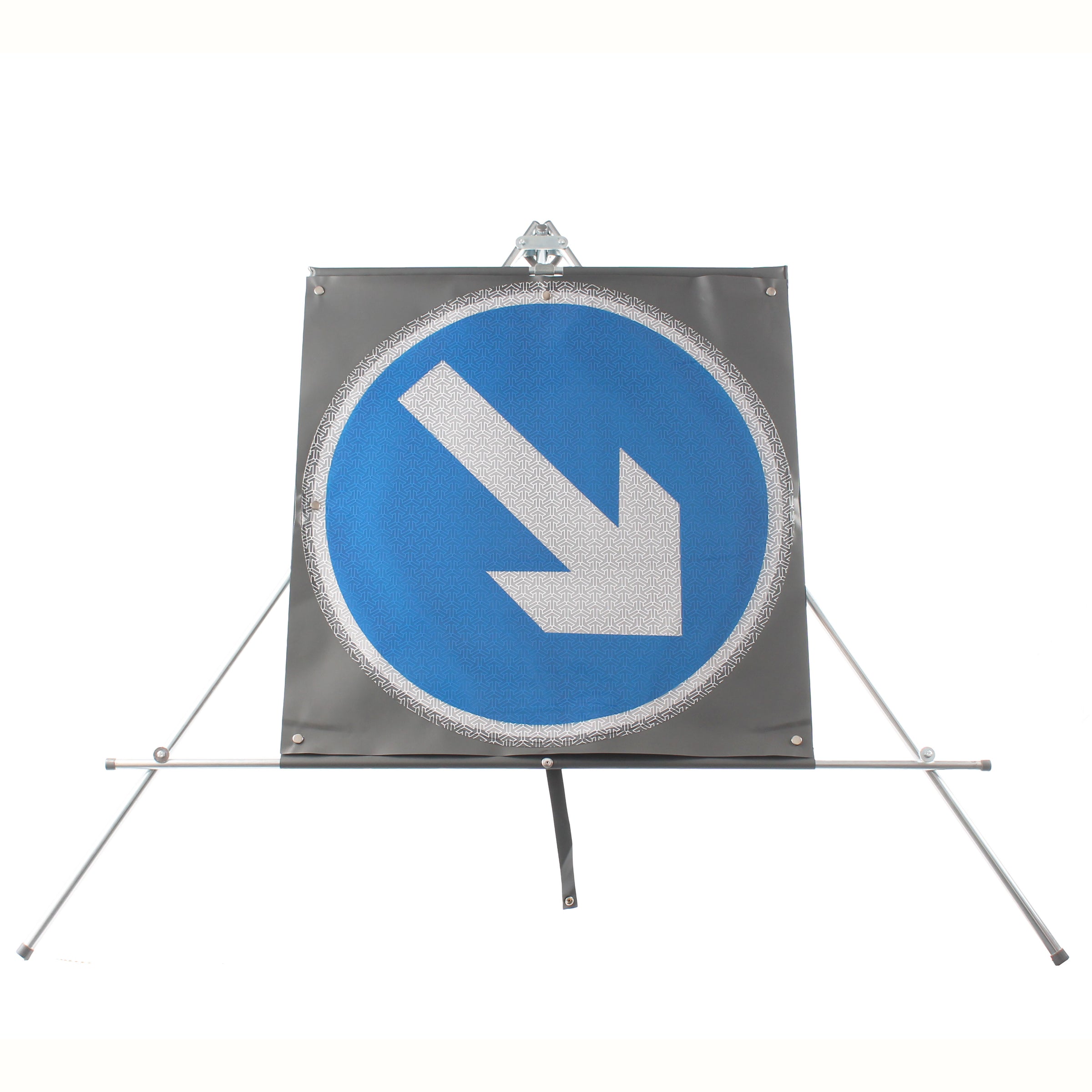 The sign frame is made from durable galvanised steel and the sign face from hard-wearing PVC. The sign face can be rolled up for transport ensuring the face is protected at all times. The sign, although compact to store and relatively lightweight has been wind tested and meets all requirements for use in line with Chapter 8 guidelines.