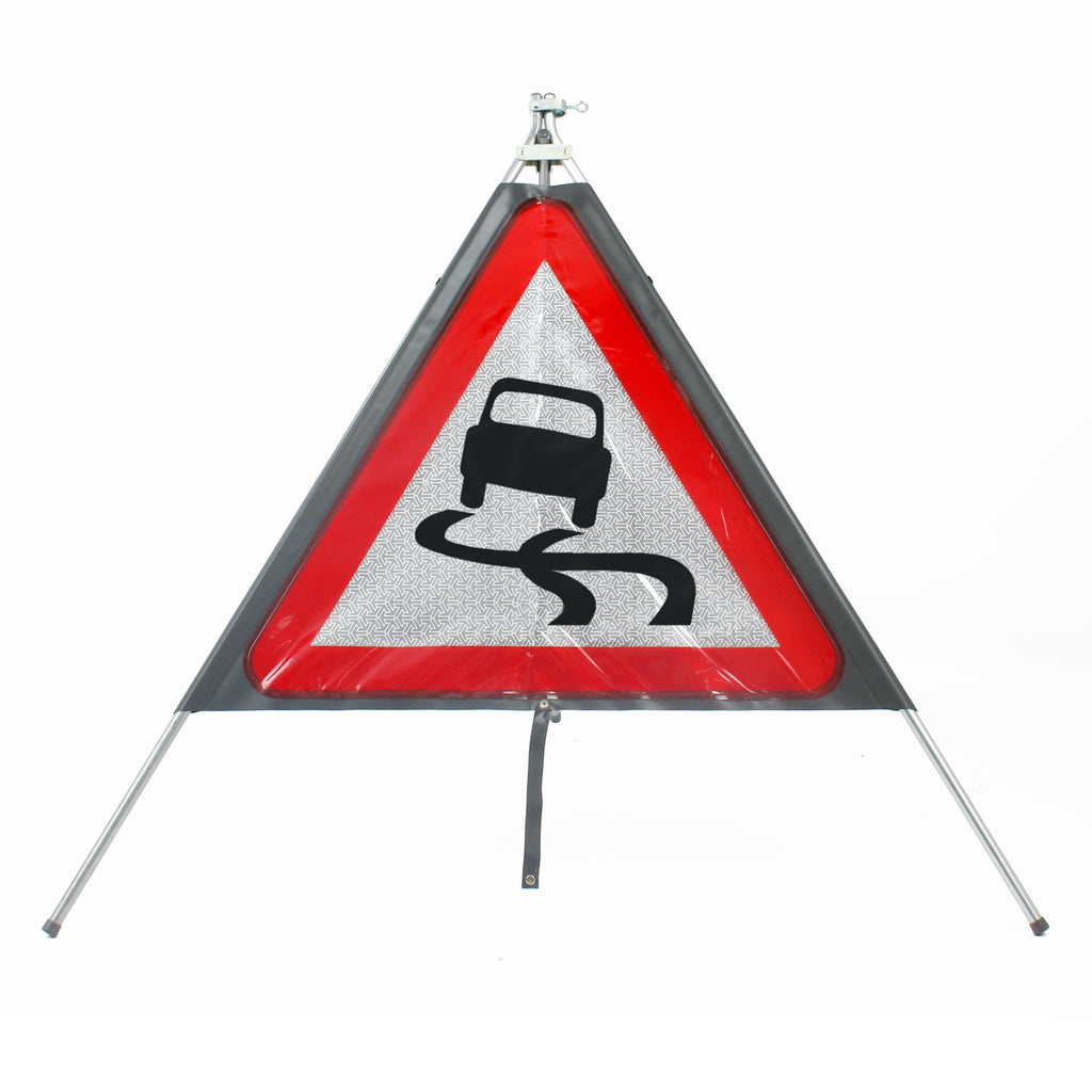 Our slippery road classic roll-up road sign is an alternative to our metal and plastic slippery road versions and comprises a PVC sign face and galvanised steel frames. These allow the sign to be completely collapsible, making the signs ideal for easy storage and transport.