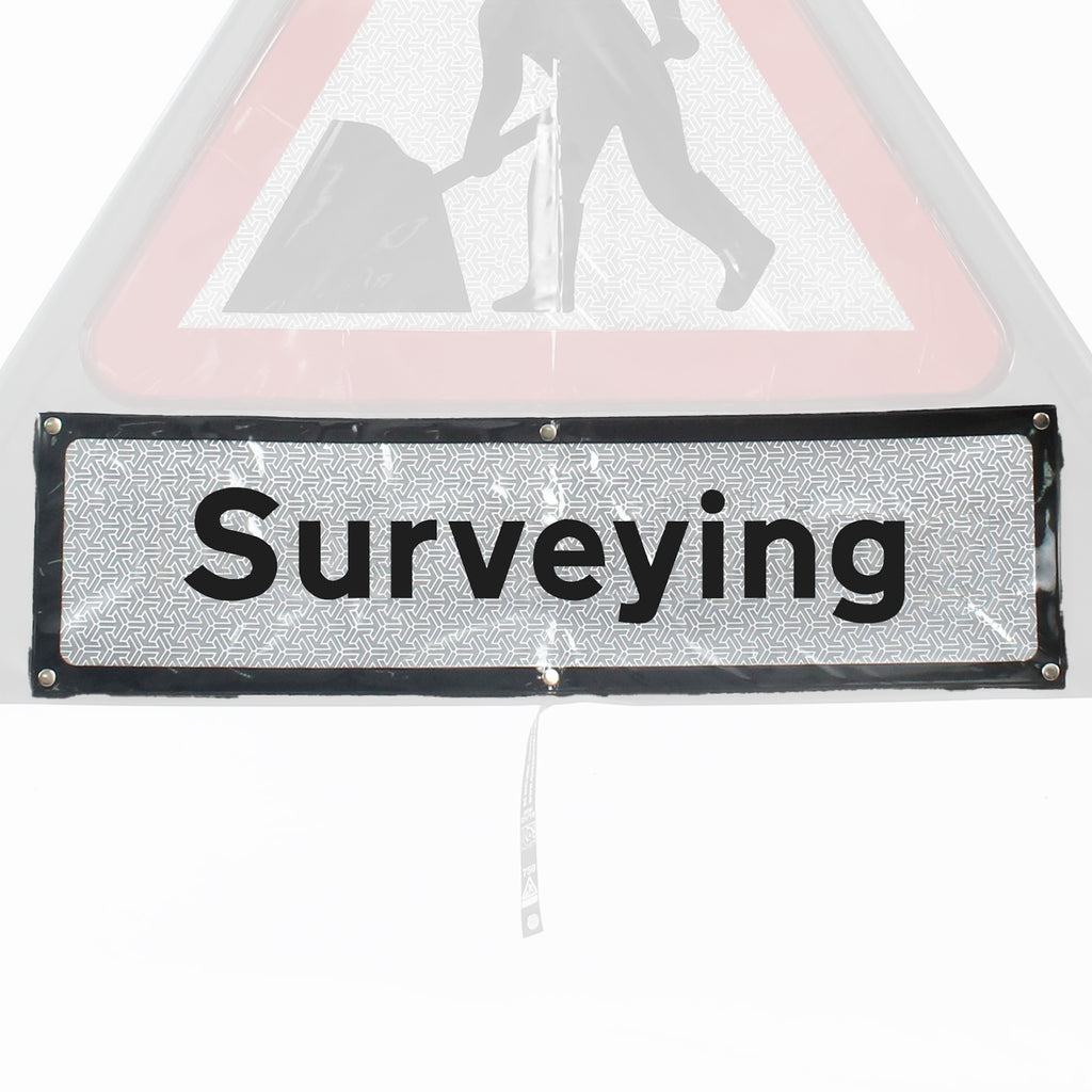 This supplementary plate can be attached to any supplementary plate capable roll up men at work sign using the built-in poppers, to warn road users of surveying taking place.