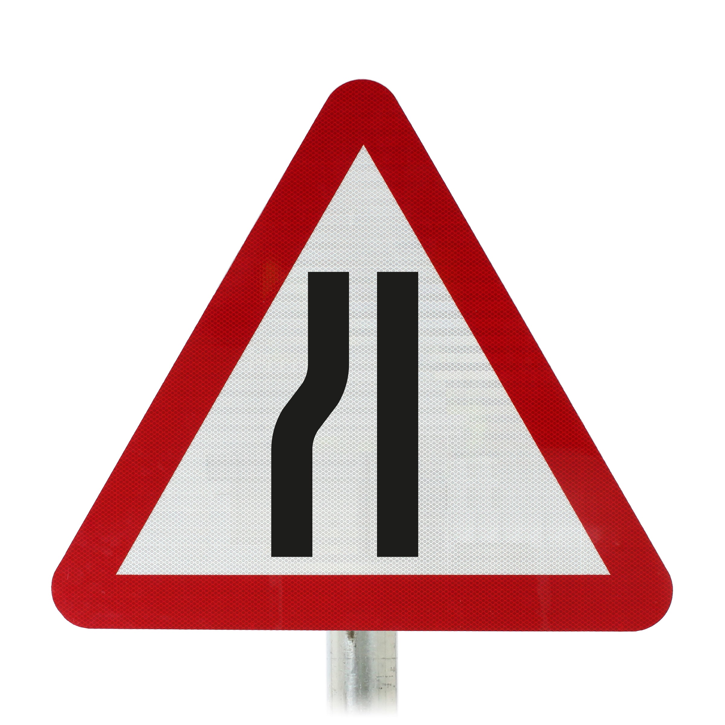 The road narrows on the left sign to diagram 517L gives an advance warning of the road narrowing on the left (current) side. This means the thinning of the route creates a potential hazard because you will have to drive closer to oncoming traffic. If the narrowing doesn't remove a lane from the junction and the lane does not have a severe taper, the sign isn't needed. Table 4-1 on page 19 of the Traffic Signs Manual, Chapter 4 covers the specific taper criteria. The alternative version of this diagram is reversed, the "Road Narrows Right" sign would be used where the right (opposite) side of the road is forced closer to the centre line.