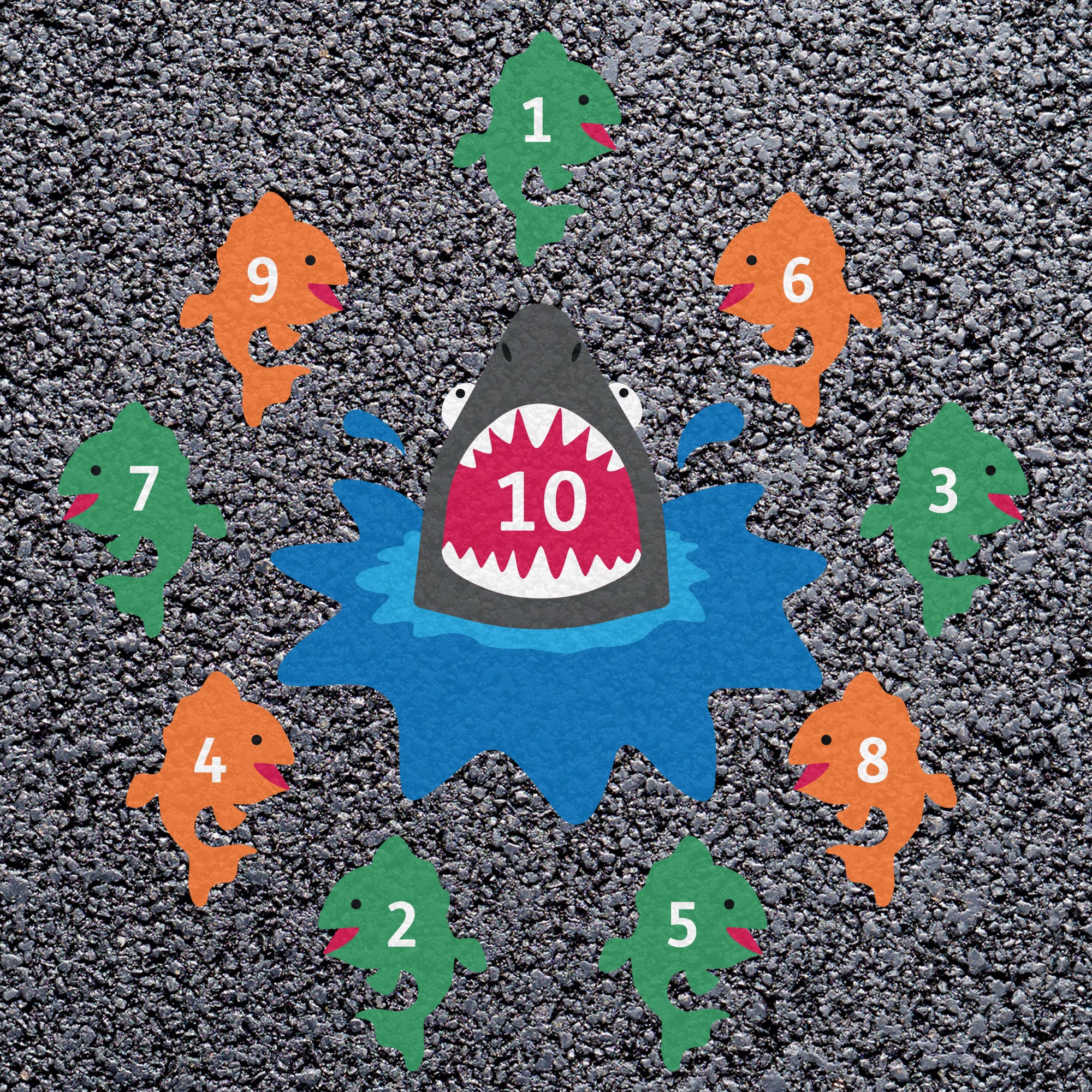 Have some marine-based fun with this brightly coloured Shark Game playground marking. This marking features nine eye-catching fish which act as outer ring targets to the central jaws style shark, which acts as bullseye within the game.