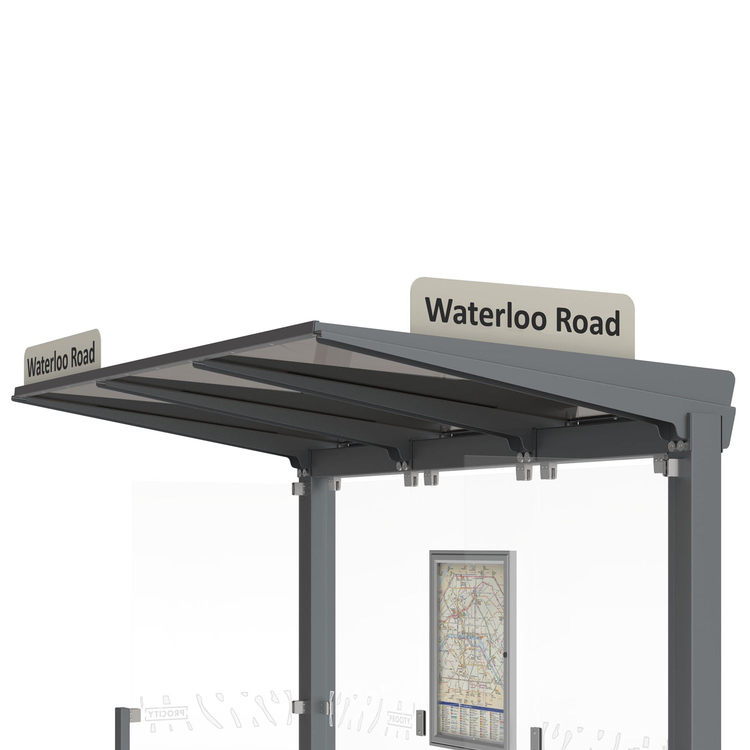This bus stop sign is intended for mounting on the side of the Procity Venice Bus Shelter roof. As an optional addition, positioning the sign on the shelter's side enables pedestrians to easily read the bus stop name as they approach. This placement is especially beneficial, considering the limited frame space available on the Venice bus shelter itself for displaying the stop name.