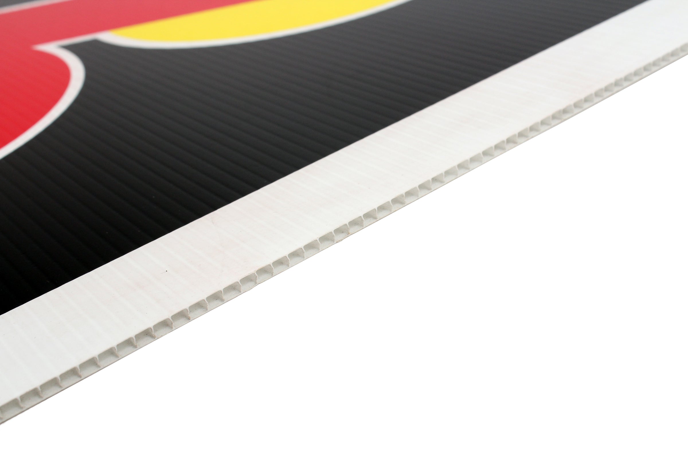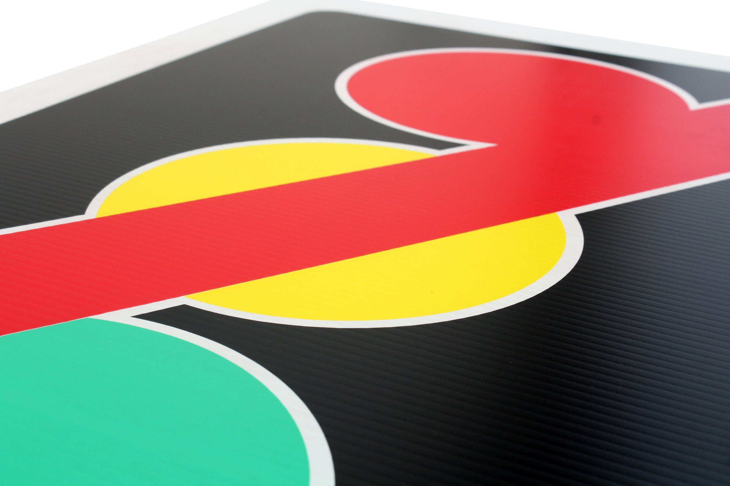 This particular sign is made from 4mm correx. This makes it lightweight, cost-effective and easily fixed with cable ties to lamp posts.