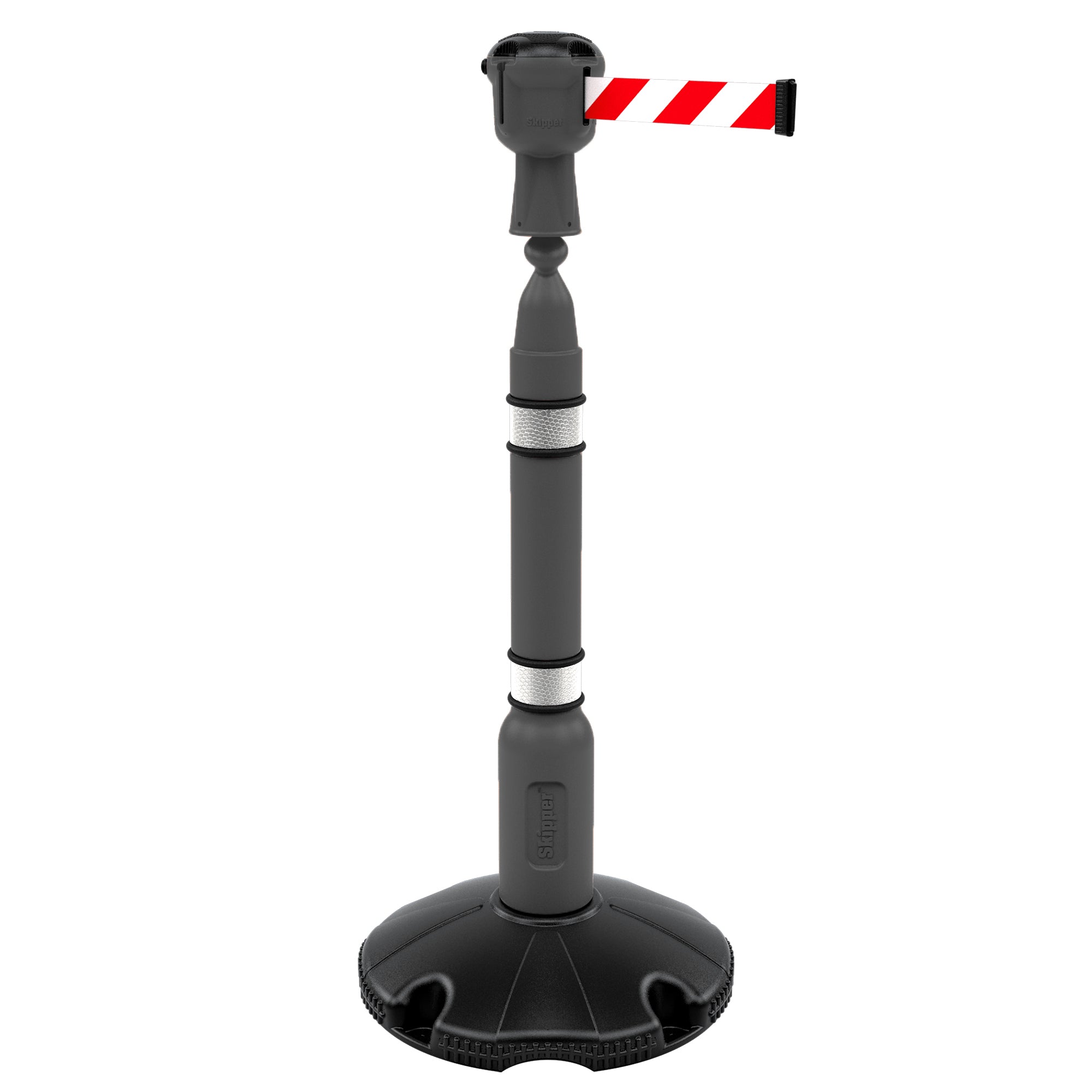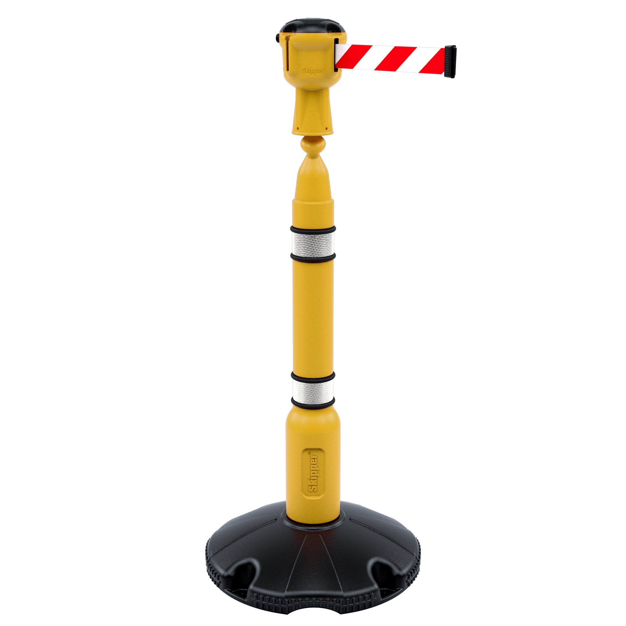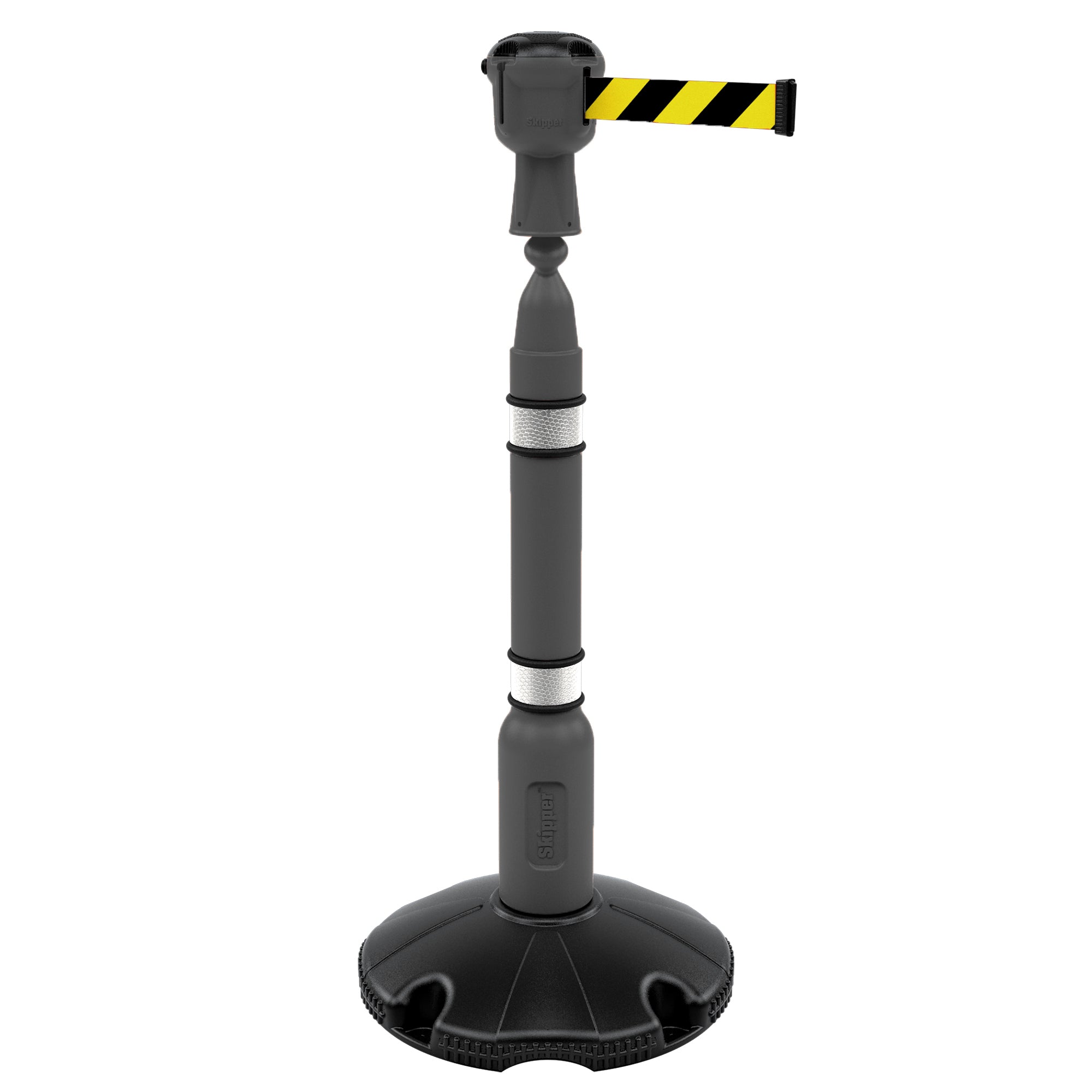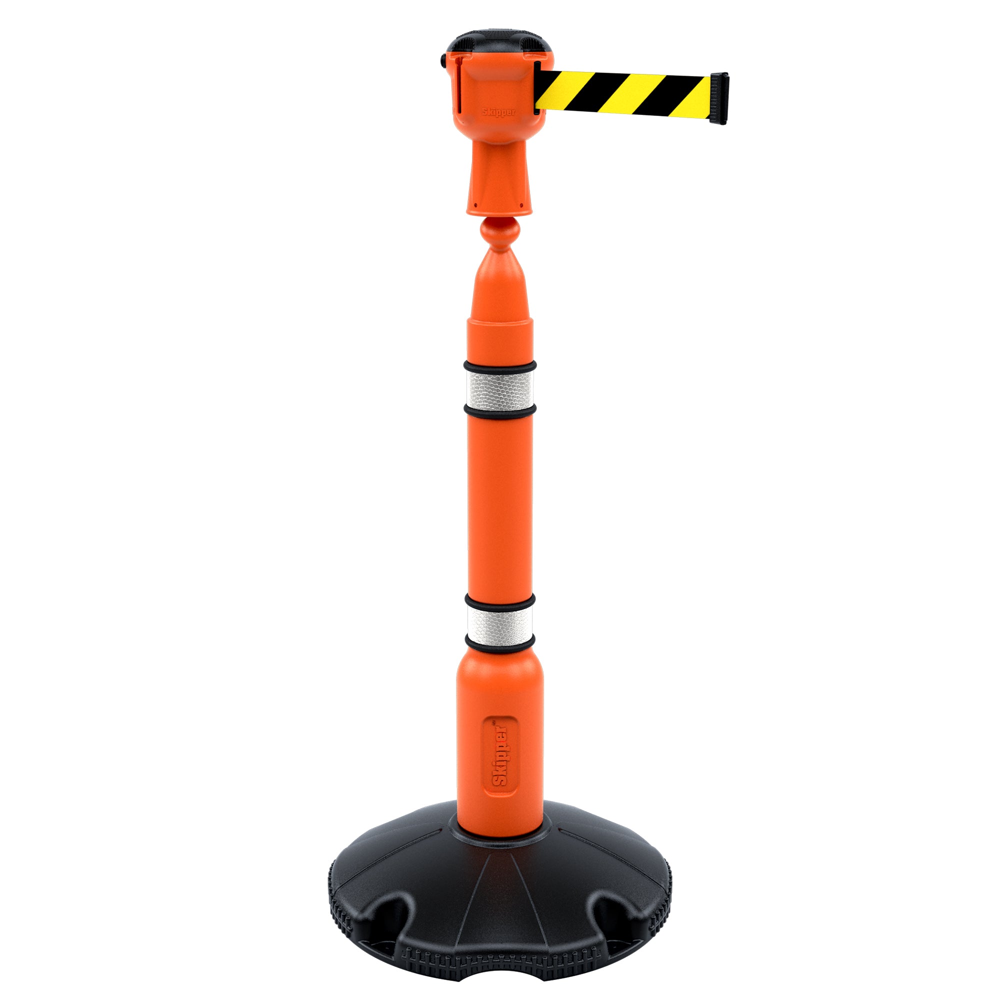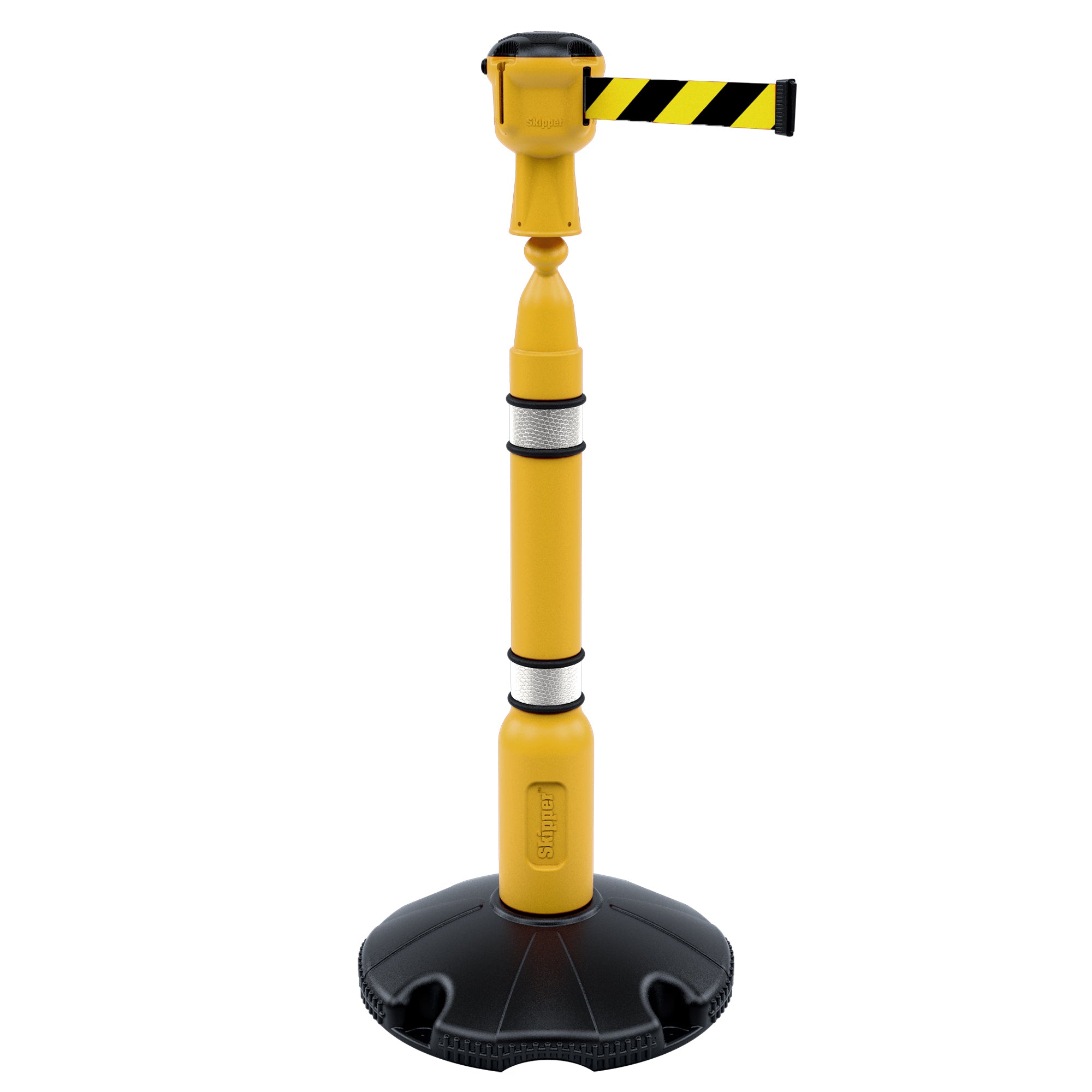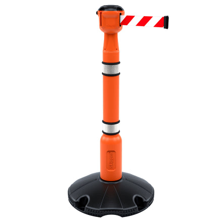 The post consists of a blow moulded top with reflective banding and a hollow base that can be filled with either water or sand. Once filled the base weighs around 10kg making it strong and sturdy. The top unit houses a belt that stretches out to 9 metres! Each head unit features 3 latching points and one belt, allowing multiple-barrier configurations to be created quickly and easily.