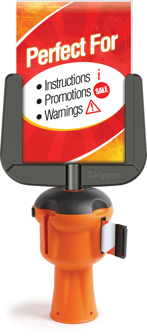 The Skipper A4 sign holder is designed to replace the top of a normal skipper dummy or retractable barrier unit. Commonly used for applications where a sign such as 'Queue Here' needs to be displayed.