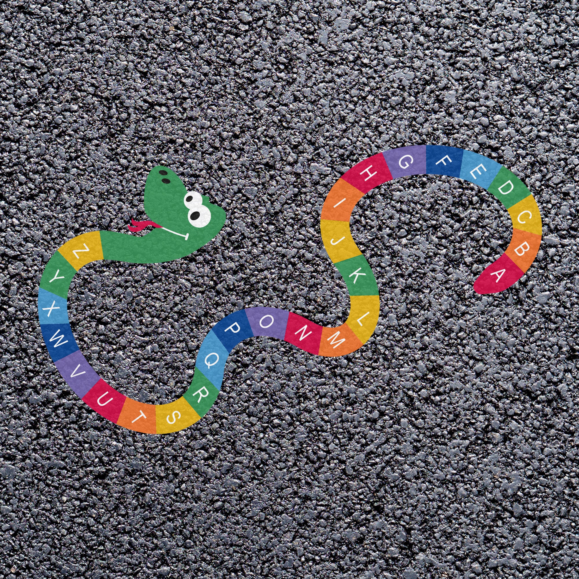 This friendly looking snake playground marking is a great addition to any playground in need of some stimulating markings to get children thinking. The snake is made from vibrantly coloured segments all of which feature a letter.