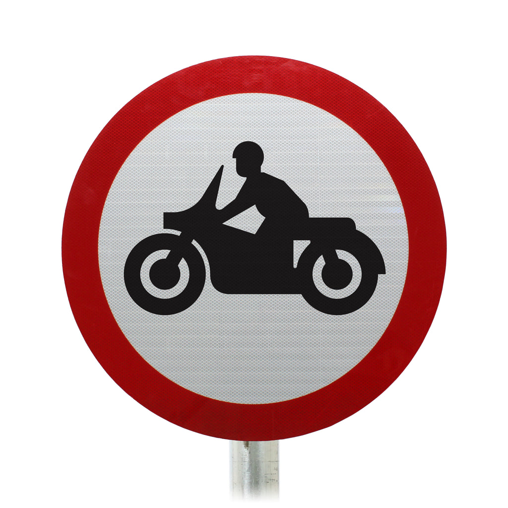 This regulatory sign means no motorcycles or related vehicles can pass. This would be used where a pedestrian or cycle route is easily accessible from the road by a motorbike, moped or scooter.
