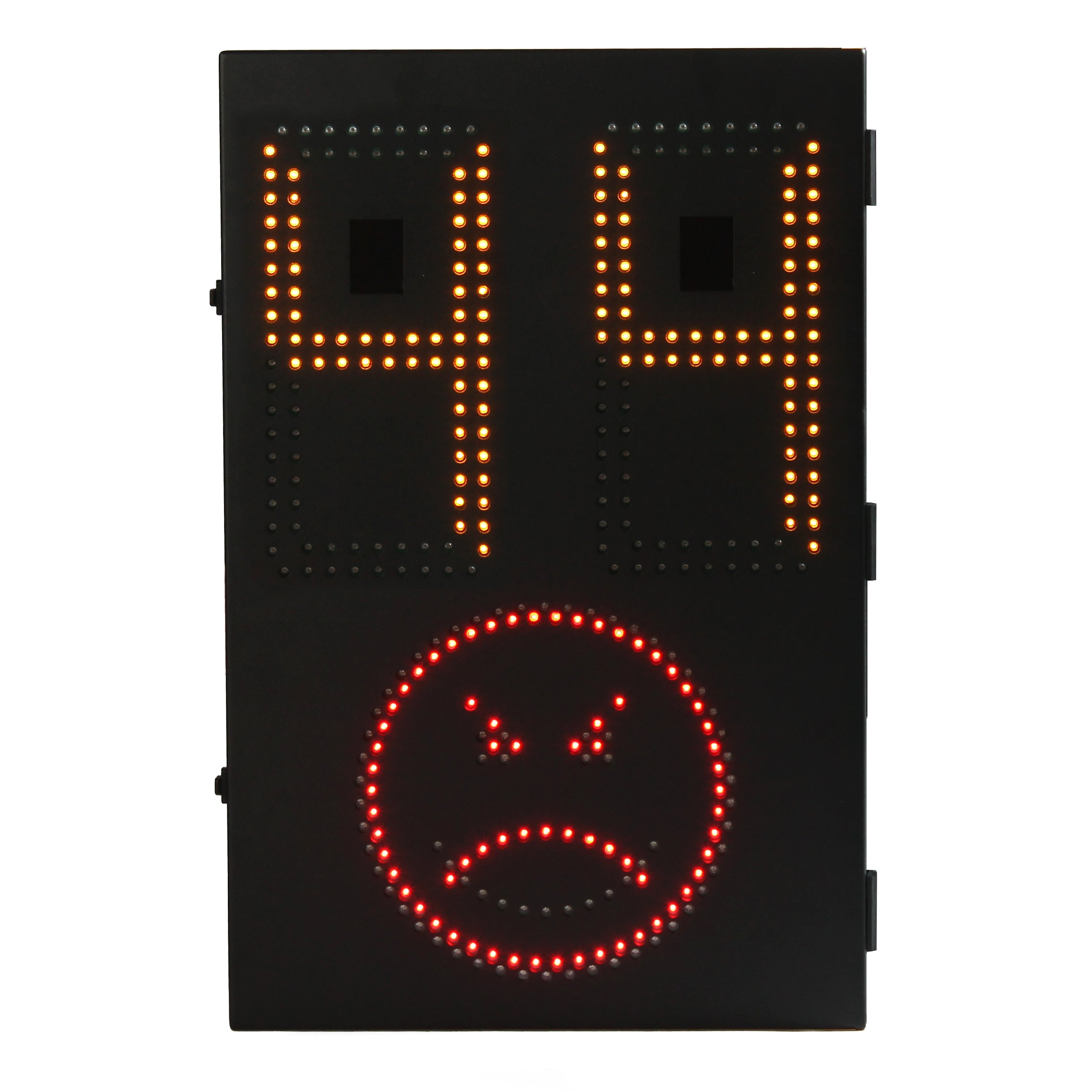 Our smiley face speed-indicating radar sign can be used to convey both a positive smiley face to those who are not exceeding the speed limit and a negative red frowning face to those who are going too fast. The quick and obvious colour difference quickly conveys either a positive or negative message to drivers.