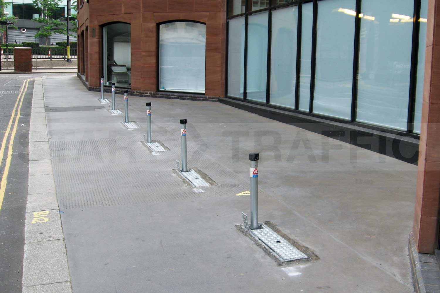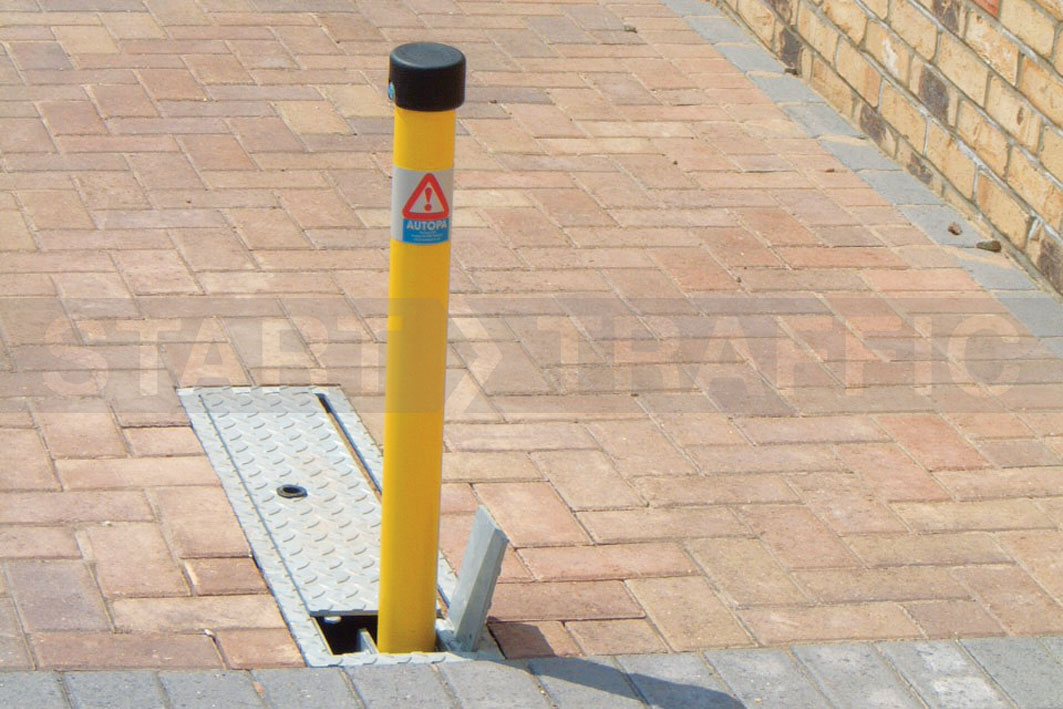 Ultra simple to operate these posts are very reliable and easy to use. The post stands 660mm above ground level when upright. When stored in the down position the entire post and “coffin” assembly sits level with the ground, covered by a checker plate lid.