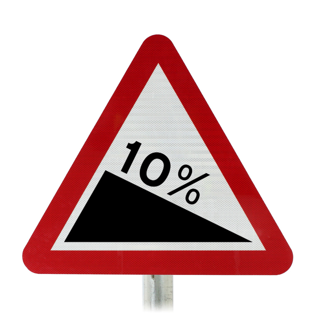 This permanent warning sign indicates that there is a steep downwards gradient ahead. The percentage marked on the sign can be varied to reflect the road conditions. Our example shows a 10% downward gradient this means that for every metre travelled forward 0.1 of a metre will be lost in elevation.