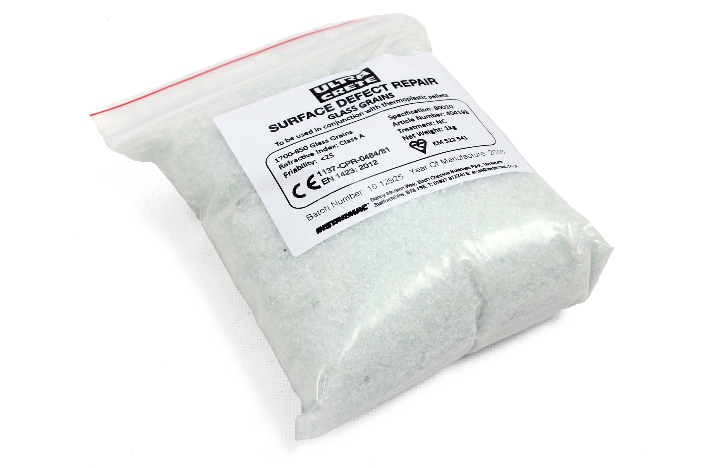 The kit comes in two parts with a 12kg bag of thermoplastic granules and a smaller 1kg pack of glass beads. The thermoplastic granules are melted to fill the defect, whilst the glass beads are sprinkled on top to develop an anti-skid surface with a skid resistance value of 60 (SRV).