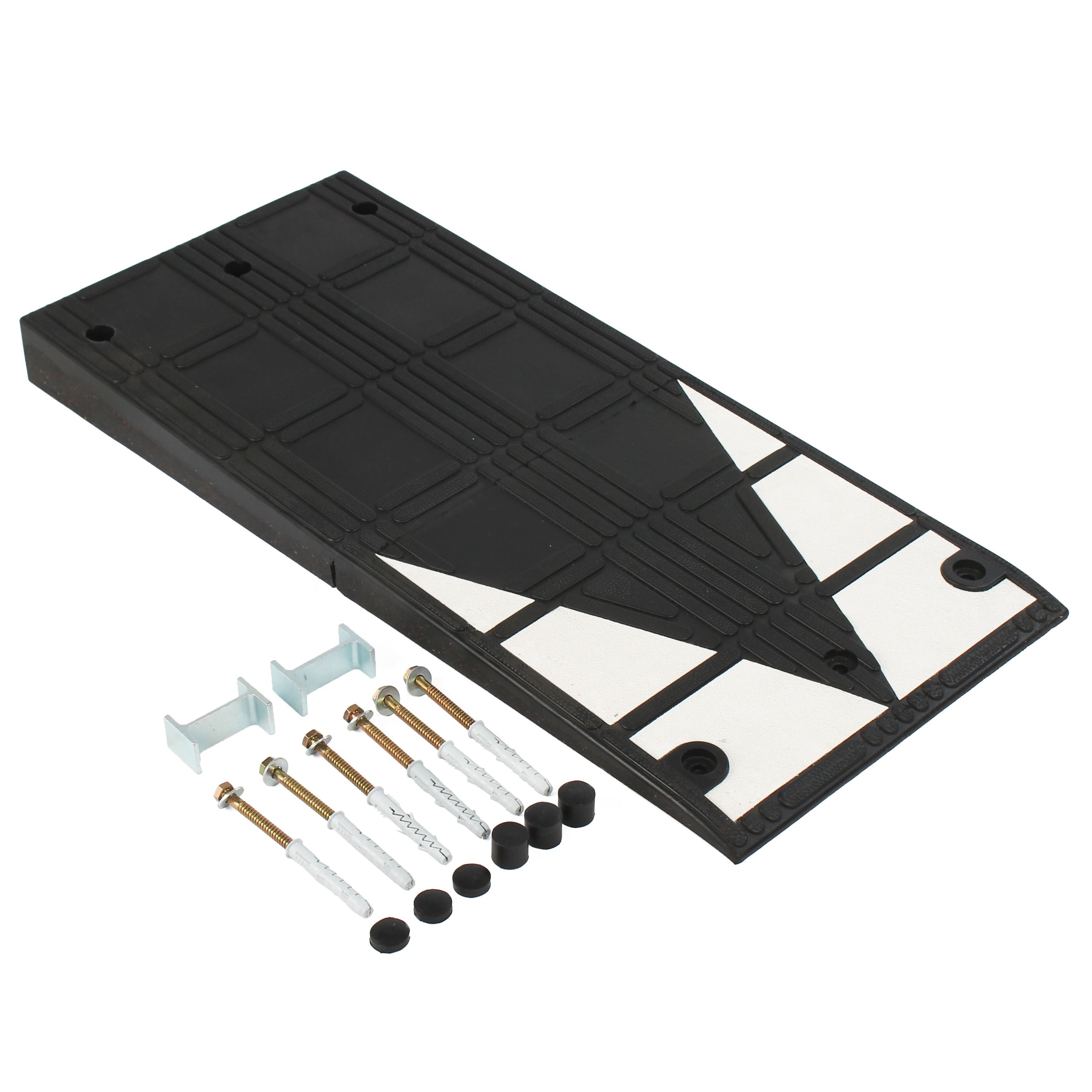 The kit comes supplied as a single ramp with fixings; the fixings do not need to be used unless you install the ramp as part of a permanent solution. If you are just installing the ramp as a temporary measure, then you are perfectly fine to do so without using the fixings. Within the fixing kit, joining tabs allow you to lock multiple ramps together both side by side and back to back. Ground anchors allow you to secure the ramp to tarmac and concrete, and rubber bungs seal over the bolt holes, ensuring weeds and high heels do not find themselves in the fixing point.