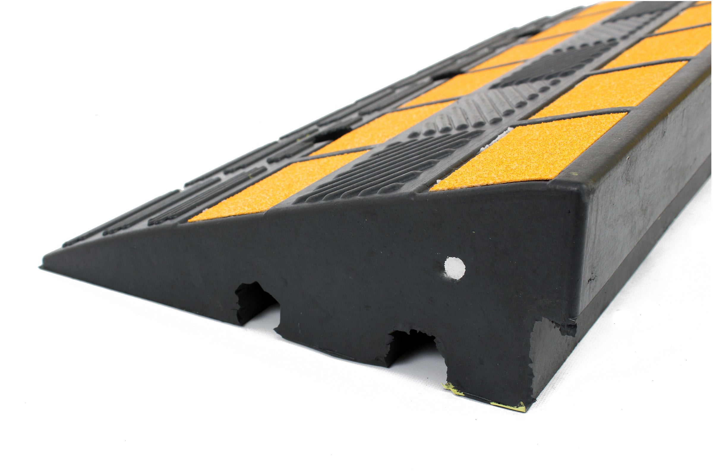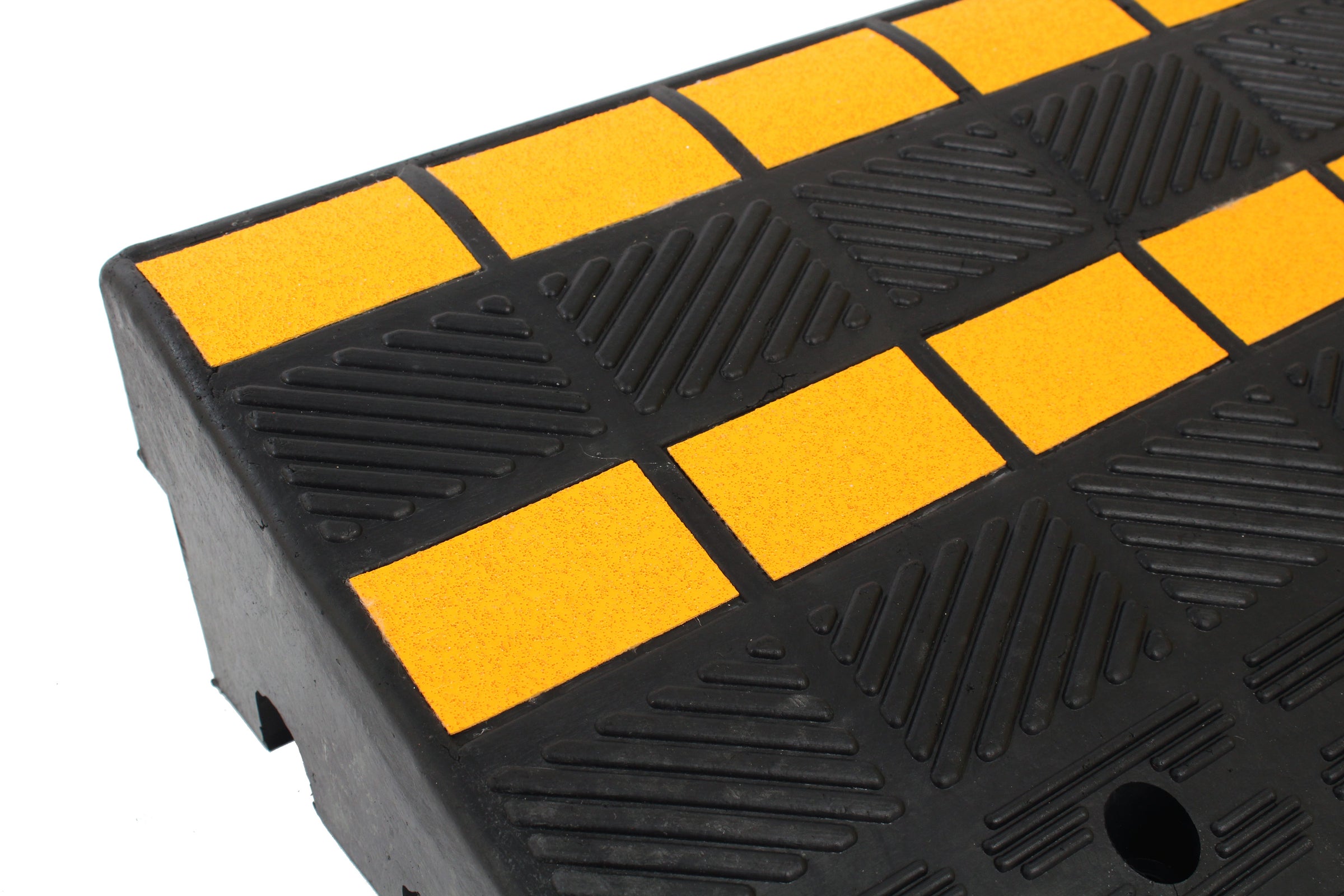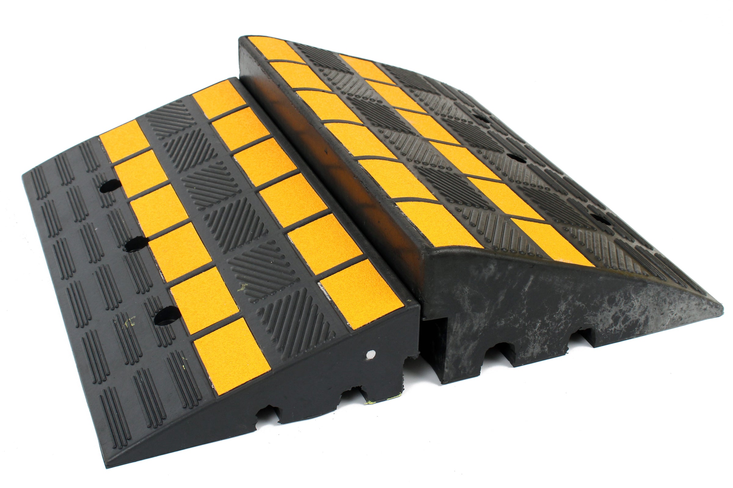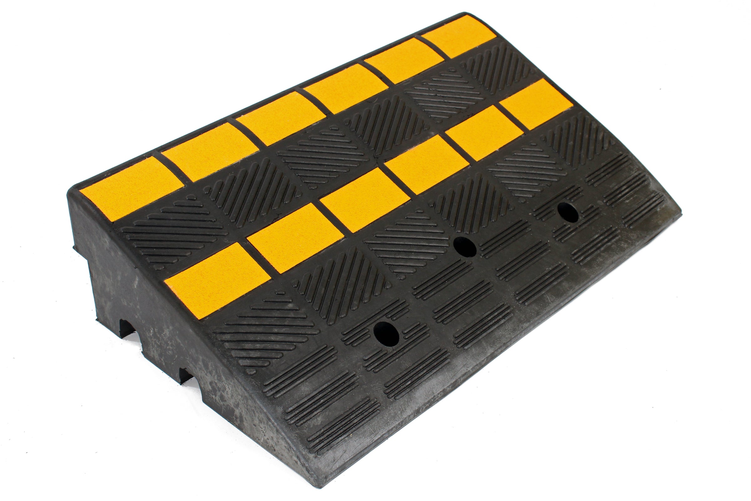 These ramps come in 2 different heights, either 100mm or 150mm tall. Both heights come with premarked holes so that they can be fixed down for more permanent applications. These rubber ramps also come with high-visibility reflective yellow inserts helping prevent any trip risks.
