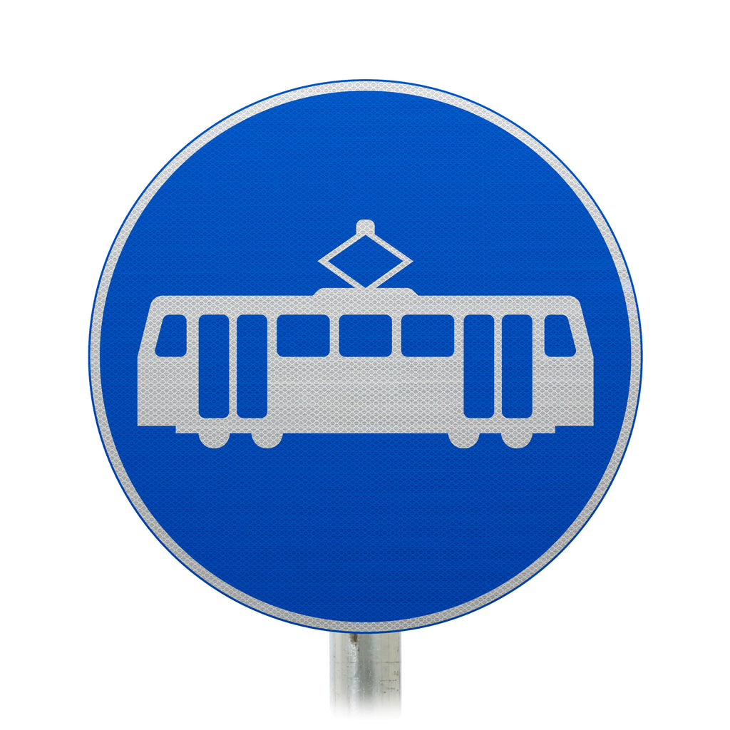 This sign is designed to indicate that the only trams or trams and buses are permitted to use the road / tramway ahead. This sign is most commonly placed where a tramway leaves an existing carriageway.