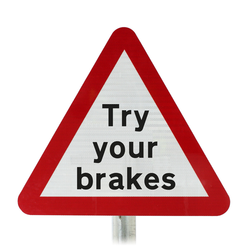 This warning sign advises drivers to test their brakes as they may fade due to overheating or from still being wet. This is a safety precaution for areas where brakes may fail such as after deep water or before a steep decline.