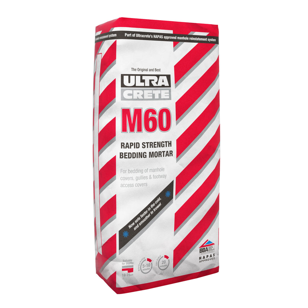 UltraCrete M60 is a rapid-strength bedding mortar that sets in just 20 minutes! Ready to open to traffic in 60 minutes, traffic flowing again. Intended for use with all access covers as well as rapid bonding of granite setts, emergency concrete repairs and flags. Conforming to HAPAS and HD27/15, ensuring this product meets industry standards and is fit for purpose. Pre-blended for convenience and accuracy. No need to spend precious time trying to figure out the correct ratio, guaranteeing excellent results.