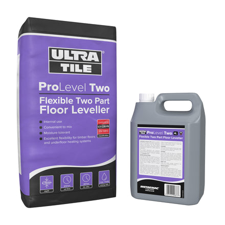 UltraTile ProLevel Two is a high-strength self-levelling compound (smoothing underlayment). It is a two-component system consisting of a powdered blend of cements, graded fillers and additives in a bag, and a pre-gauged polymer liquid in a bottle. This ensures accuracy and eliminates the guesswork involved in determining the correct ratio. Tiles can be applied to the internal subfloors in as little as 24 hours, and the fast set time enables light foot traffic in 2.5 hours.