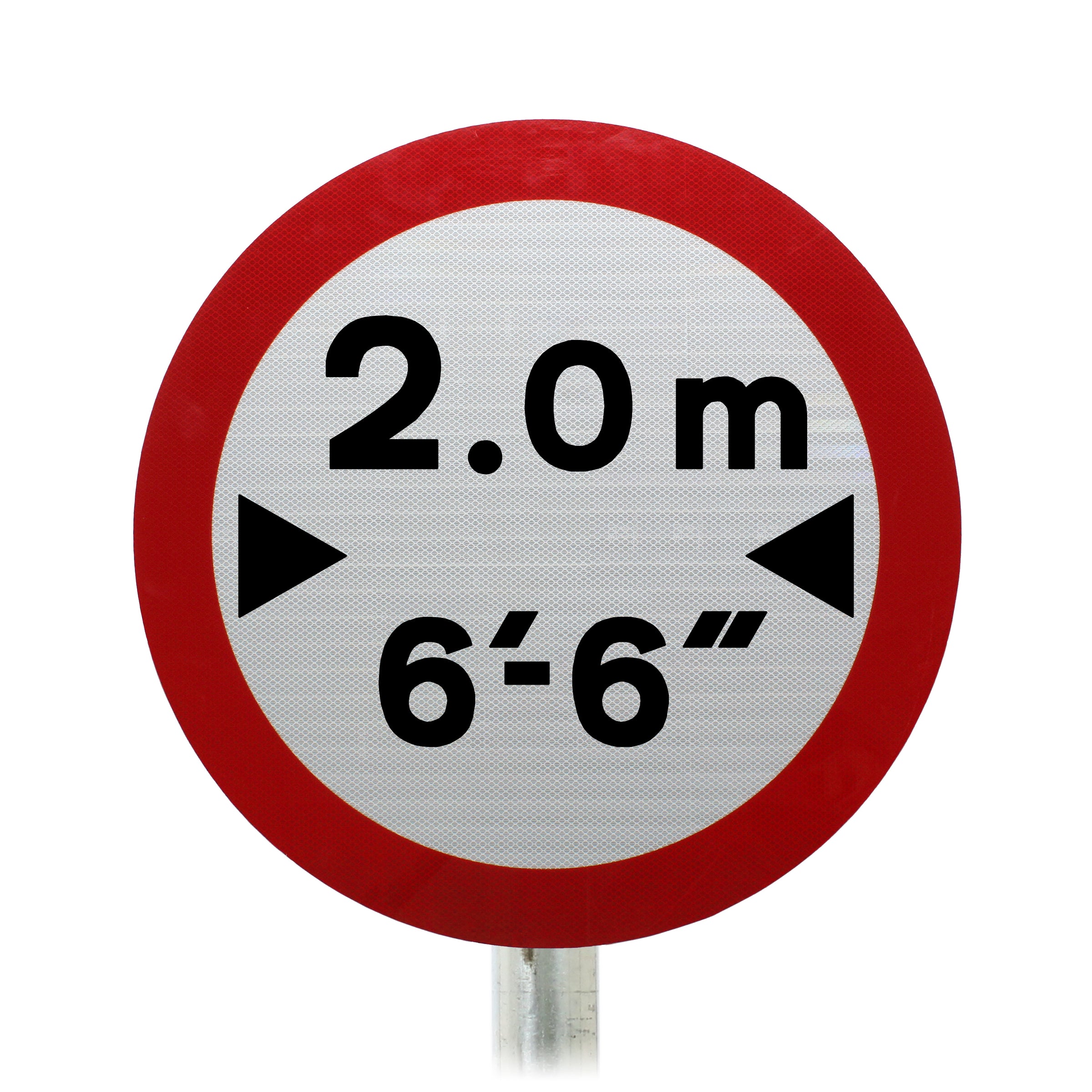 The sign contains two measurements with the top line specifying a width in metres and the lower line in feet and inches. This sign is most commonly seen with the following measurements 2.0m and 6’-6” as this prohibits most lorries and heavy goods vehicles.