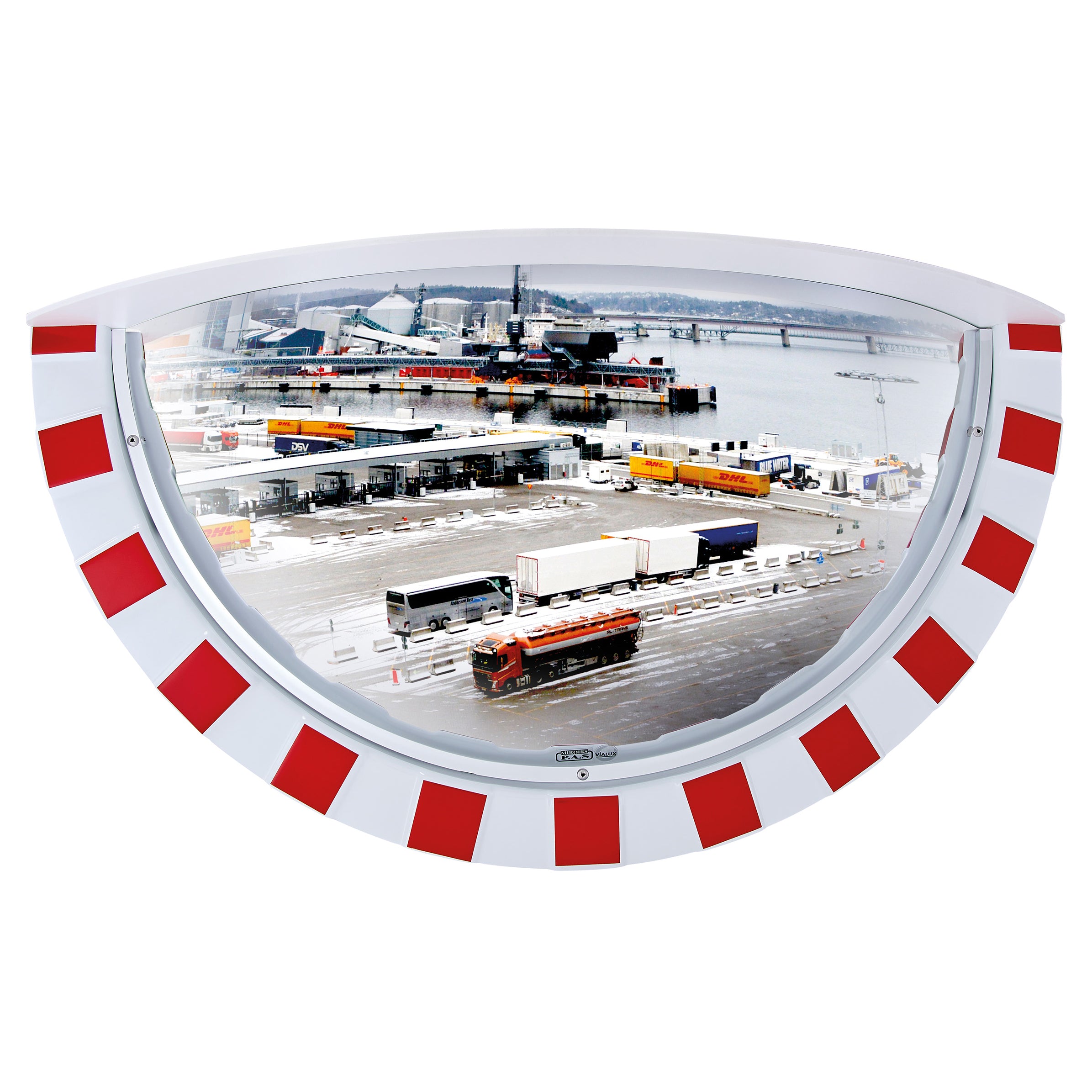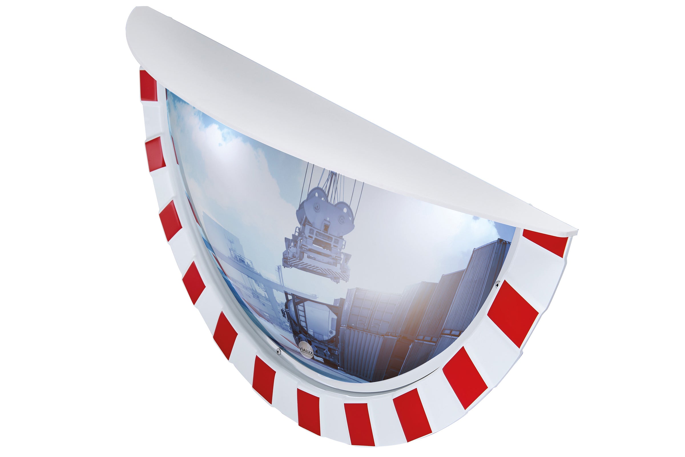Fitted with a sun shield to keep rain and sun glare off the lens this Vialux wide angle mirror gives a clear view in three directions allowing drivers of any vehicle, forklifts, shunting trucks or container lorries to make an informed choice as to whether the path is clear before proceeding from a blind spot.