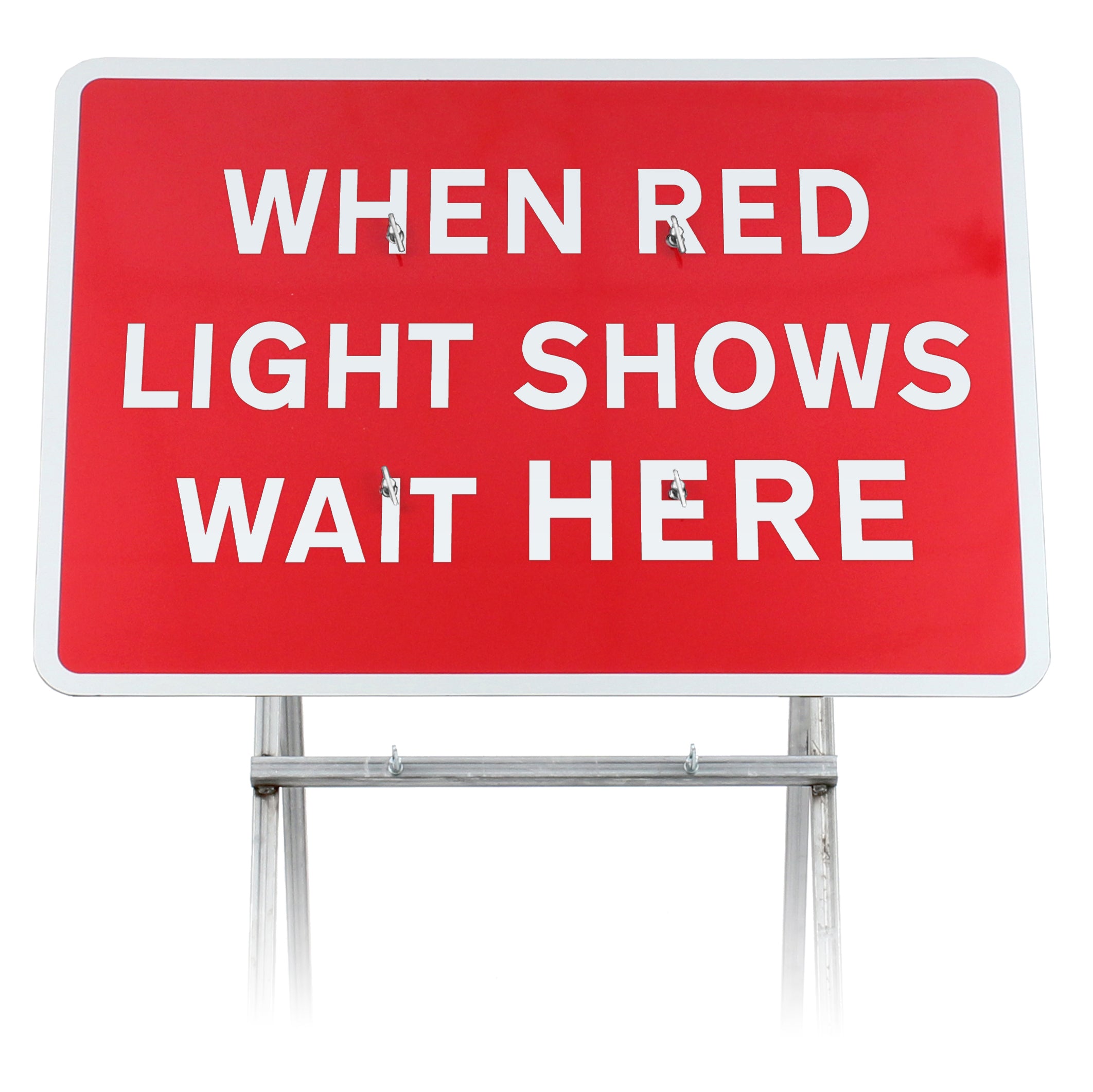 The When Red Light Shows Wait Here sign is used to indicate the stopping point for vehicular traffic when approaching traffic lighted temporary roadworks.