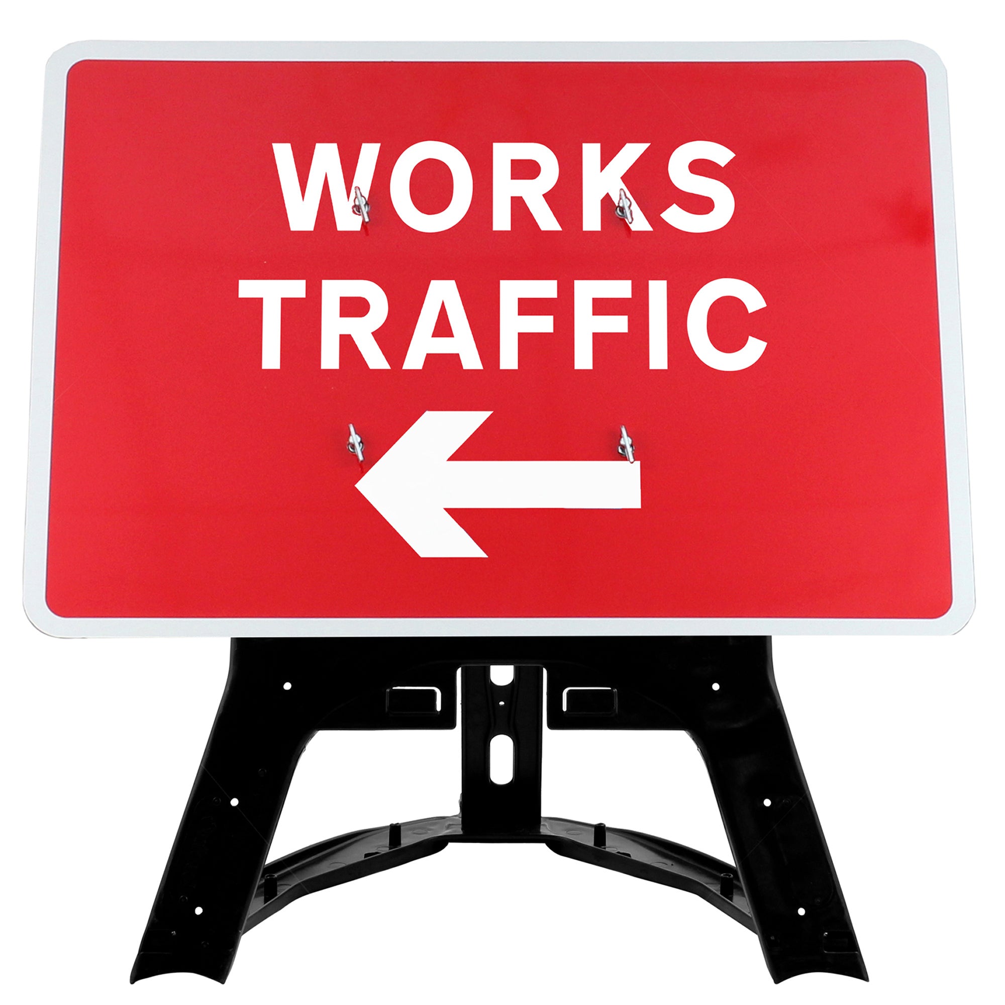 Our Works Traffic Arrow Left 7304 QuickFit EnduraSign is used to inform works traffic and construction traffic to use a specific entrance to a site. It can be set up and help avoid trucks and other heavy vehicles taking a route that would disturb local residents. This sign indicates that works traffic should turn left, we also have a Works Traffic Right EnduraSign available.